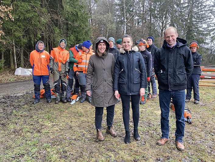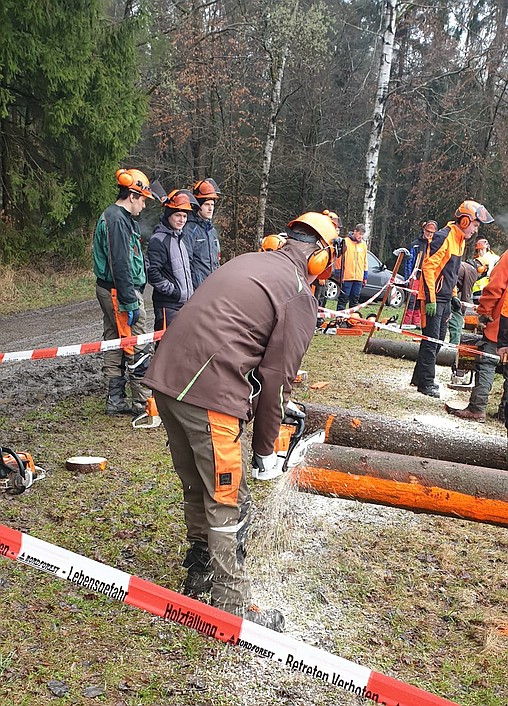 Die Schüler:innen konnten ihr Können bei der Erledigung unterschiedlicher Aufgaben unter Beweis stellen. Eine Aufgabe war es zum Beispiel, beim sog. Kombi-Schnitt einen möglichst geraden Trennschnitt mit der Motorsäge hinzubekommen.