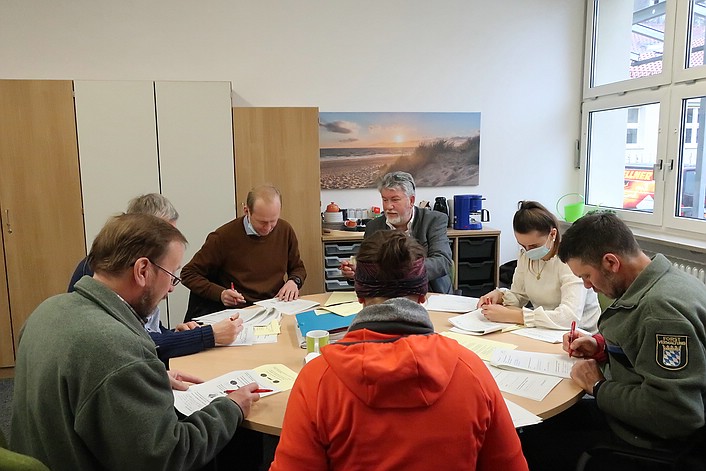 Um 09.15 Uhr trafen die Tests der ersten Gruppe ein. Um die Ergebnisse für die Siegerehrung am frühen Nachmittag möglichst zügig beisammenzuhaben, wurde gemeinsam mit weiteren Lehrkräften der Berufsschule sowie Mitarbeitern der ÄELF - Bereich Forsten - korrigiert. Da es sich um forstwirtschaftliche Inhalte handelte, waren wir bei der Korrektur der ein oder anderen Frage durchaus froh, diese Expert:innen zur Seite zu haben.