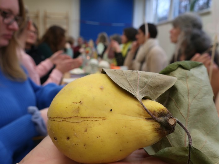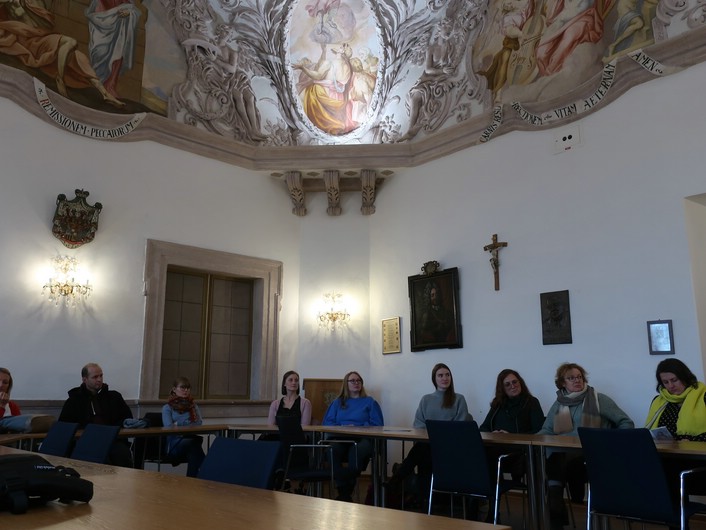 Aufgrund des regnerischen Wetters fand der Großteil in der schönen Kapelle des Schlosses statt, wo wir den Erzählungen lauschten.