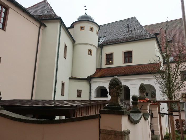 Die Lehrkräfte hatten nach dem Frühstück zwei Möglichkeiten. Ein Angebot bestand darin gemeinsam zu backen und anschließend beim Kaffee die gebackenen Leckereien zu vernaschen. Das andere Angebot war eine Stadtführung in Neustadt, bei der auch wir Referendarinnen teilnahmen. Zu Fuß ging es ins Neustädter Zentrum, wo uns vor dem ehemaligen Schloss bereits zwei Stadtführer erwarteten. Sie waren elegant in alter traditioneller Robe gekleidet und erzählten die Geschichte Neustadts.