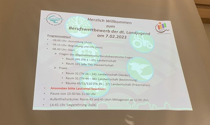Am Dienstag, den 07.02.2023, fand der diesjährige Berufswettbewerb der deutschen Landjugend statt. Unter dem Motto „Mit Herz und Hand – smart fürs Land“ gingen an rund 45 Schulstandorten knapp 10.000 Teilnehmer*innen aus unterschiedlichen beruflichen Bereichen an den Start. Der Wettbewerb richtete sich an Auszubildende aus Land-, Forst-, Haus- und Tierwirtschaft sowie dem Weinbau.