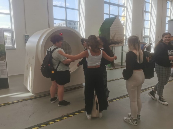 Die Klassen hatten viele Möglichkeiten sich selbst auszuprobieren: von 60km/h Windkraft bis hin zum 23°-geneigten Zimmer. Das interaktive Museum ermöglichte unter anderem durch Fühlen und Hören ein ganzheitliches Lernen.