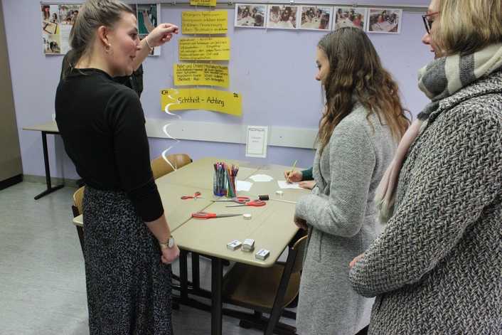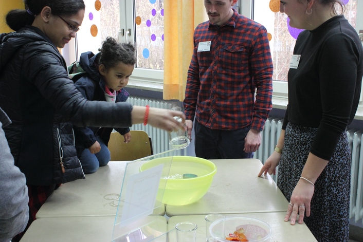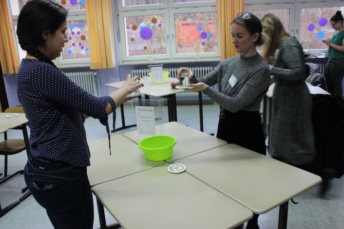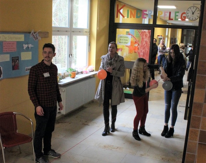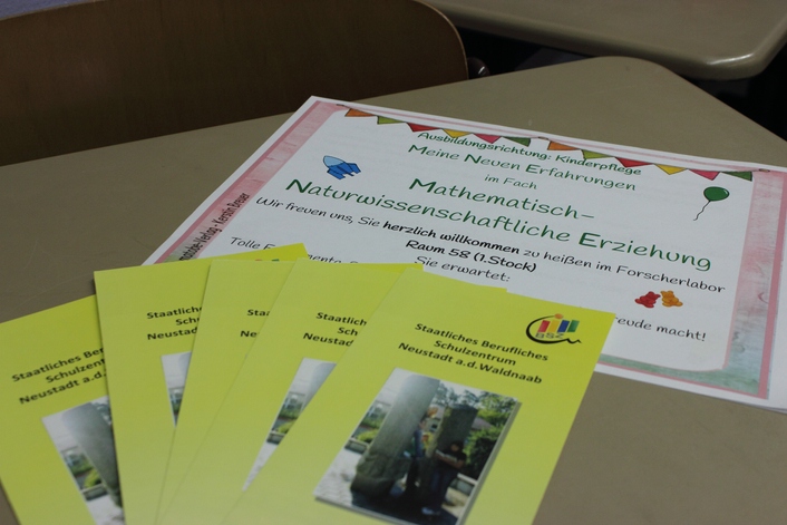 Im Rahmen des Infotags des BSZ boten die ReferendarInnen einen Einblick in das Fach Mathematisch-Naturwissenschaftliche Erziehung der Ausbildungsrichtung Kinderpflege. Bei einer Vielzahl an Experimenten für Kindergärten konnten die Interessierten sich eine Vorstellung davon machen, was sie bei der Ausbildung erwartet. Dabei steht im Vordergrund, wie die angehenden KinderpflegerInnen den Kindern Phänomene der Natur sowie Zahlen- und Mengenwelt ein Stück weit greifbar und verständlich machen können. Durch Abwechslung und Spaß wurde die Veranstaltung zu einem kurzweiligen Vergnügen.