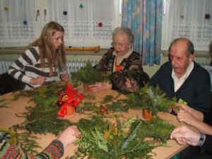 | Besonders viel Freude bereitete den Schülern als auch den Senioren die gemeinsame Gestaltung eines Adventsgesteckes bzw. eines Watte-Schneemannes, die die Senioren als eine Erinnerung an diesen Tag mit nach Hause nehmen konnten. Bei dieser gemeinsamen Tätigkeit kam man sich noch ein Stück näher. | |