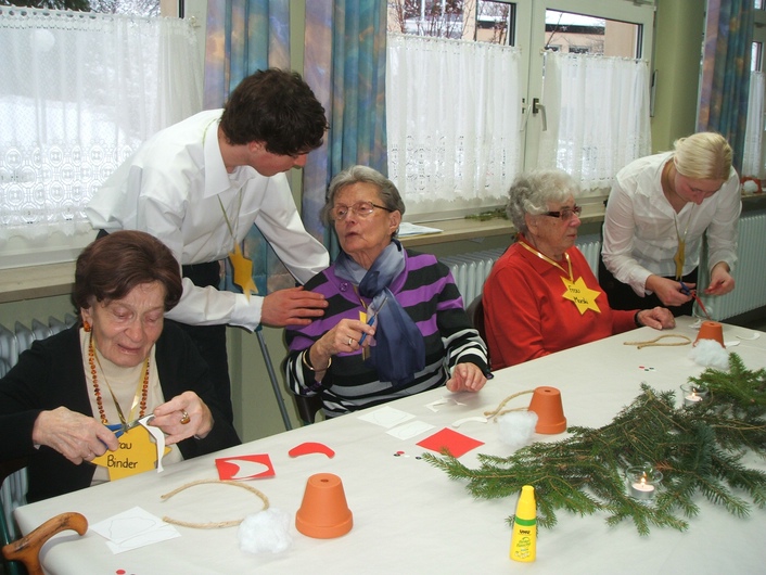 | Besonders viel Freude bereitete den Schülern als auch den Senioren die anschließende gemeinsame Gestaltung eines Weihnachtsmannes, den die Senioren als eine Erinnerung an diesen Nachmittag mit nach Hause nehmen konnten.
