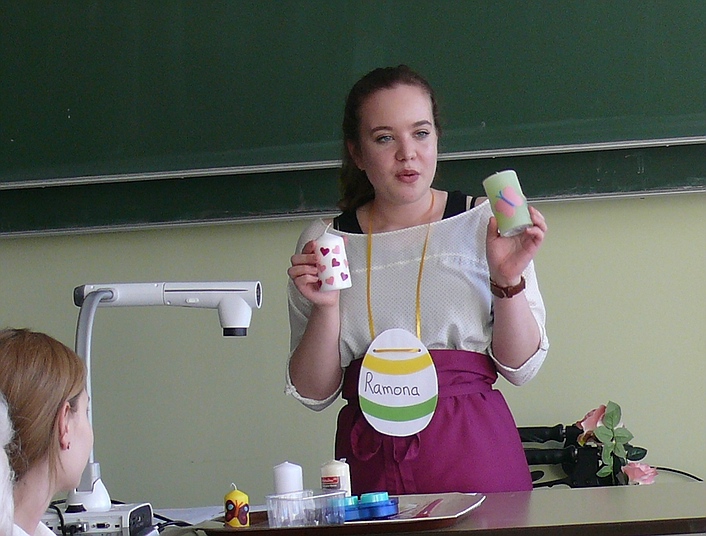 Nun stellte eine Schülerin die ausgewählte Gestaltungsaufgabe vor: Sie möchten mit den Senioren individuell verzierte Kerzen gestalten. |