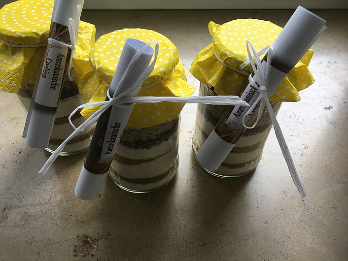 Ein besonderes Mitbringsel aus der Küche sind selbst gemachte Backmischungen. Dafür wurden die trockenen Zutaten für Cookies in gut verschließbare Gläser geschichtet. Dann wurde noch die Backanleitung angehängt und der Backspaß kann beginnen! |