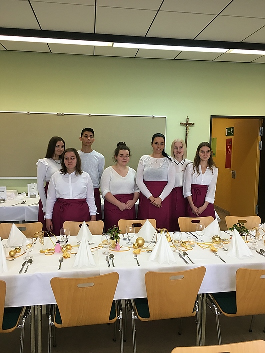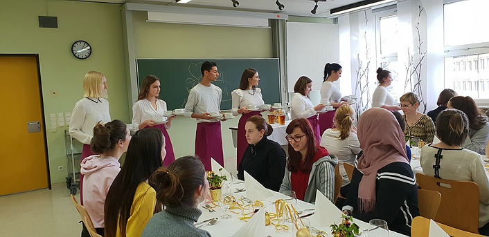 Die Schüler und Schülerinnen des Wahlpflichtfaches "Gastronomie und Hotellerie" deckten die Tische festlich ein und servierten zwei Gänge des Menüs. |