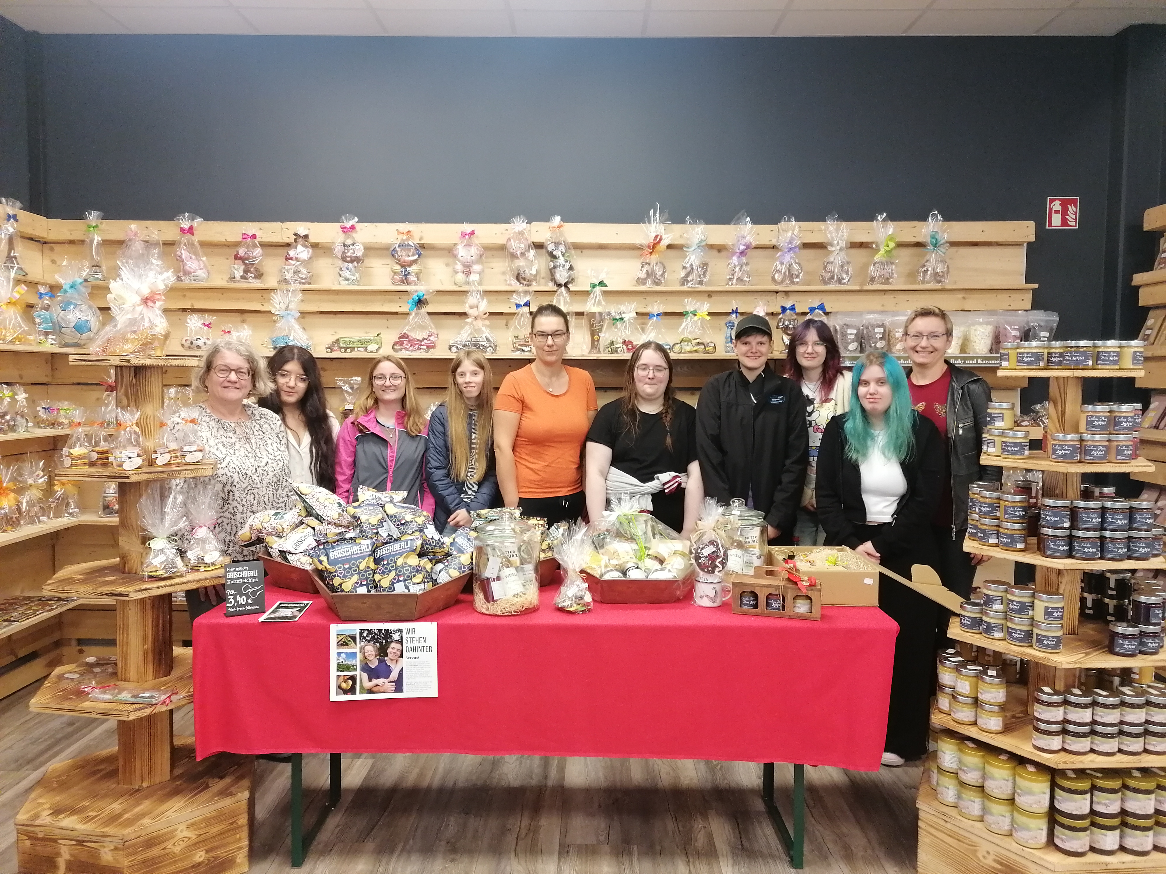 Nach einem kurzen Spaziergang stellte sich die Eigentümerin des Hofladens, Corinna Nitschko, vor und führte das gut sortierte Geschäft. Sie legt besonderen Wert darauf, dass die Produkte aus der Oberpfalz stammen. Dabei stellte sie einzelne Lebensmittel vor. Die Schülerinnen waren vom Angebot an handgefertigten Schokowaren besonders begeistert. Außerdem konnten sie erfahren, dass es möglich ist, wochentags dort zu frühstücken und ein frisch gekochtes Mittagessen einzunehmen. Selbst konnten sie einen Joghurt mit Müsli und verschiedene Aufstriche probieren bevor jede einzelne ihren Einkauf tätigte. Mit einem gemeinsamen Foto bedankten sich die Schülerinnen für die Möglichkeit, auch dieses breite Angebot kennenzulernen.