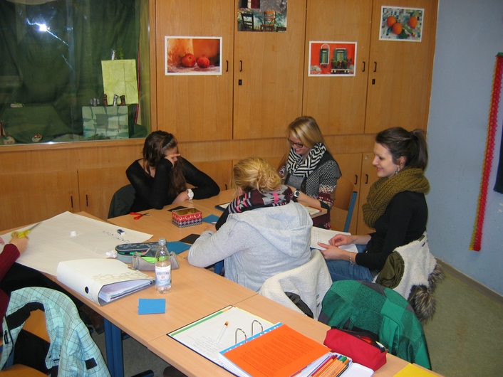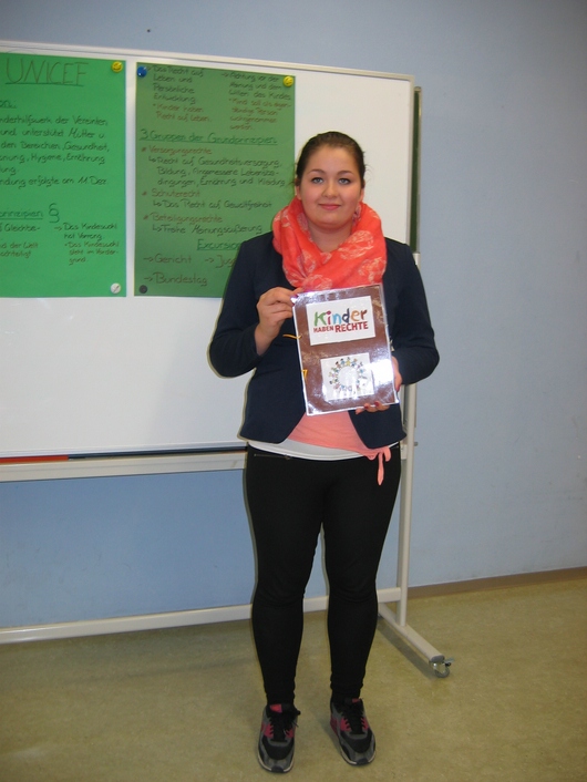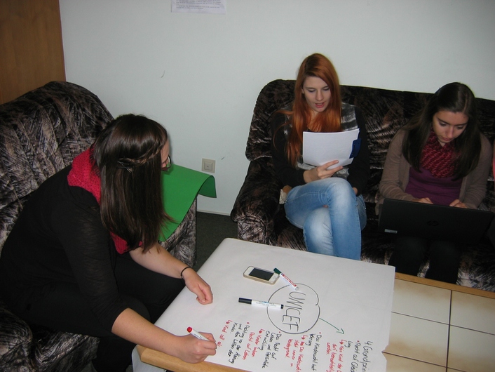 Dabei teilten wir uns in Gruppen auf und entwickelten verschiedene Möglichkeiten, die wir uns anschließend einander vorstellten. In den einzelnen Gruppen entstanden so z.B. ein Bilderbuch über "Kinderrechte", ein Memory-Spiel sowie ein filmgestütztes Referat. Des Weiteren plante eine Gruppe einen Stationenlauf, der eventuell durchgeführt werden soll.