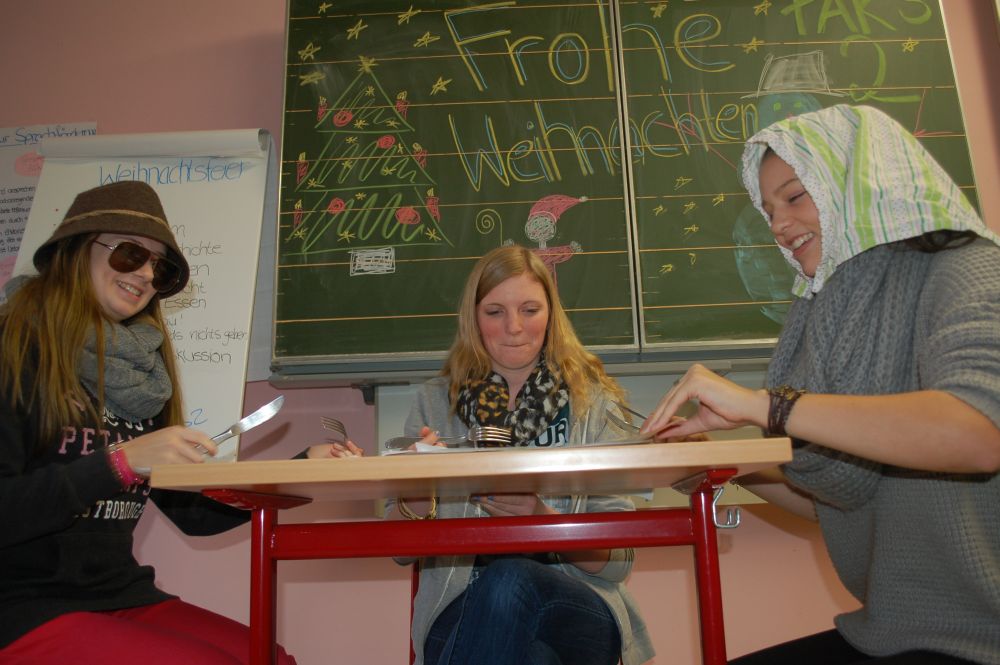 Nach einem besinnlichen und nachdenkenswerten Text trugen die Studierenden Sarah Deubzer, Sarah Praschel und Franziska Sperl einen eingeübten Sketch vor, der den Umgang mit den weihnachtlichen Geschenken auf sehr humorige Art und Weise überdenken ließ.