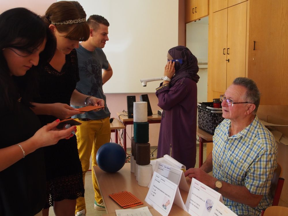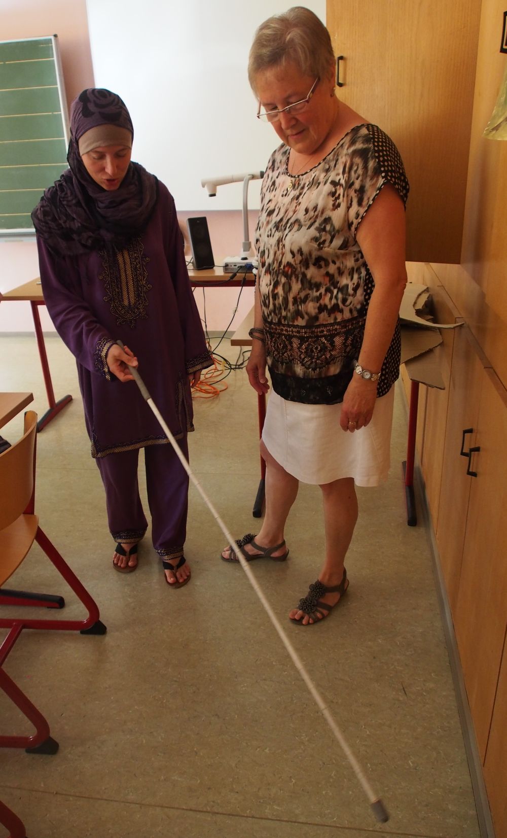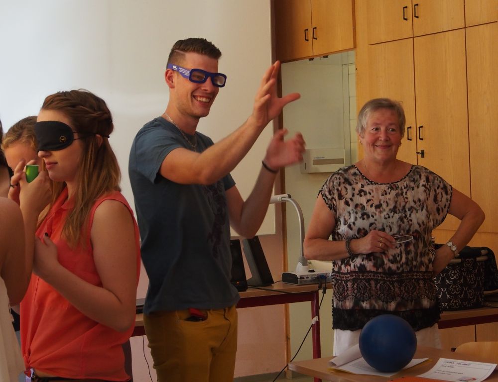Hoch engagiert erzählte die Schulbeauftragte, die ehrenamtlich tätig ist, über ihre vielfältigen Einsatzgebiete und Aufgaben als Schulbeauftragte. Der Schwerpunkt liegt in der Unterstützung der Lehrkräfte, v.a. im Bereich der Grundschule, bei der Sensibilisierung von Kindern für das Thema „Gemeinsam leben – mit und ohne Behinderung“. Frau Götz erzählte von den angebotenen Workshops, deren Ziel es ist, ein tiefgreifendes Verständnis für „Integration und Inklusion“ von Menschen mit Behinderung in unserer Gesellschaft zu schaffen. In insgesamt 8 Stationen, so die Referentin, wird den Schülern nahe gebracht, was es beispielsweise bedeutet, schlecht zu hören oder Einschränkungen im Sehen zu haben. Begeistert nahmen die Studierenden das Angebot an, die einzelnen Stationen selbst auszuprobieren. Das Gehen mit dem Langstock, das Lauschen nach einem Glöckchenball, das Ertasten von Gegenständen sind nur einige Beispiele von selbst ausprobierten Stationen.