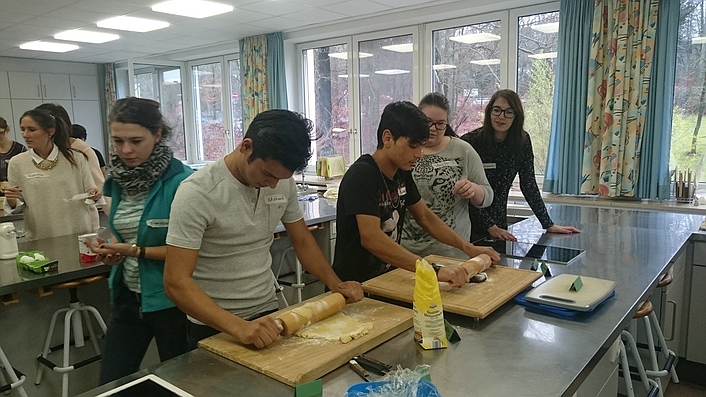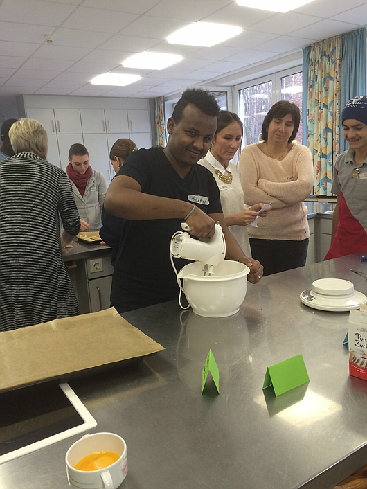 Das Angebot wurde gerne angenommen und die jungen Männer waren mit Feuereifer bei der Sache. Sie überraschten die Studentinnen mit unerwarteten Fähigkeiten wie perfektes Trennen von Eiern und selbstständiges Reinigen des Arbeitsplatzes.