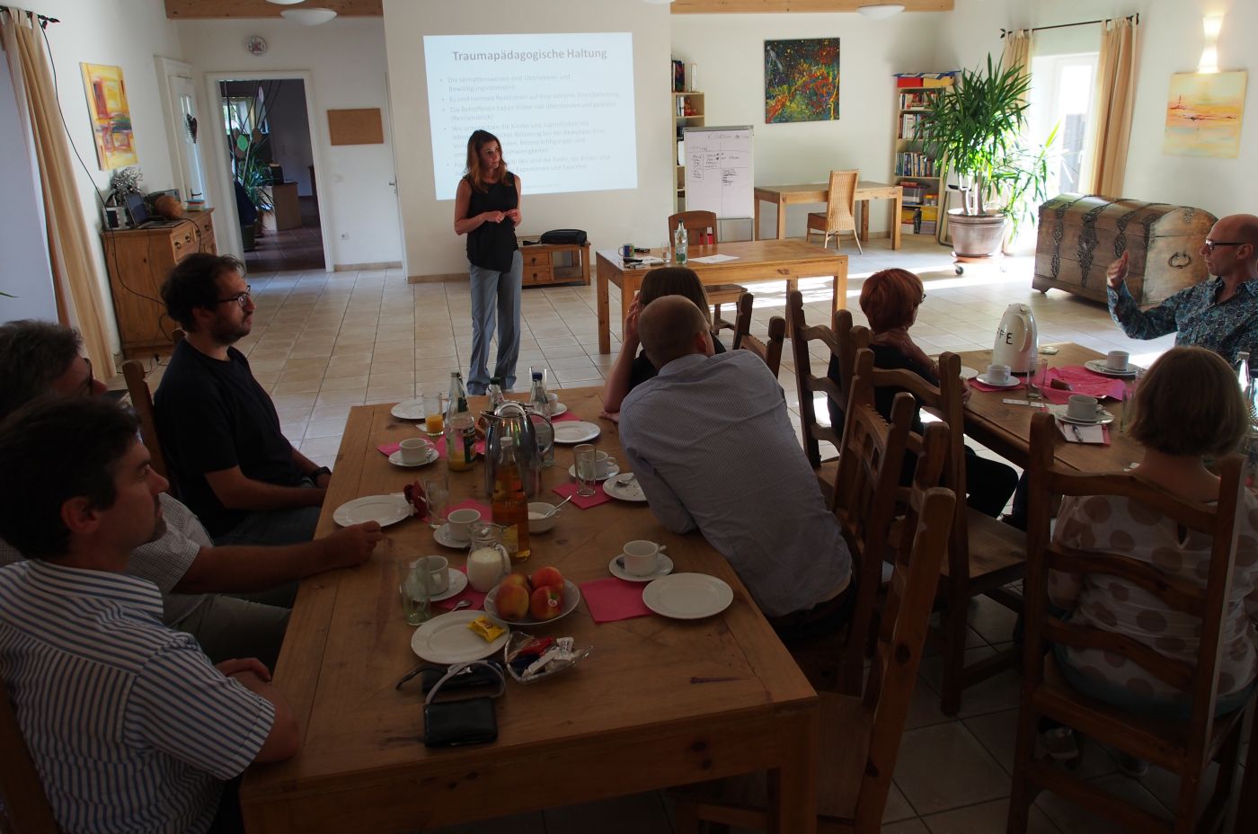 Nach einer kurzen Stärkung in einem Cafe in Sommerhausen ging es dann mit den Autos weiter nach Bimbach in der Nähe von Prichsenstadt. Dort wurde das Team von der Sozialpädagogin Eva-Maria Hoffart herzlich empfangen, die in dem beschaulichen Ort Leiterin des bundesweit einmaligen Projektes "Schulchen" ist. In einem liebevoll hergerichteten Bauernhof werden unter der Woche einige schwer traumatisierte Kinder und Jugendliche in geschützter Umgebung von einer Sozialpädagogin, ein Förderschullehrerin, einer Ergotherapeutin und einem Erzieher im Anerkennungsjahr unterrichtet. Die Beschulung, Betreuung und Therapie der Schüler im Alter von 6 - 16 Jahren erfolgt daher durch ein multiprofessionelles Team. Ziel ist es die Kinder und Jugendlichen in einer geschützen Umgebung zu entlasten, damit sie nicht mehr durch belastende Faktoren an ihrer Leistungsfähigkeit behindert werden. Besonders beeindruckend waren auch die theoretischen Ausführungen zur Traumapädagogik, welche die sympathische Referentin immer wieder durch beeinduckende Beispiele aus der Praxis verdeutlichte.