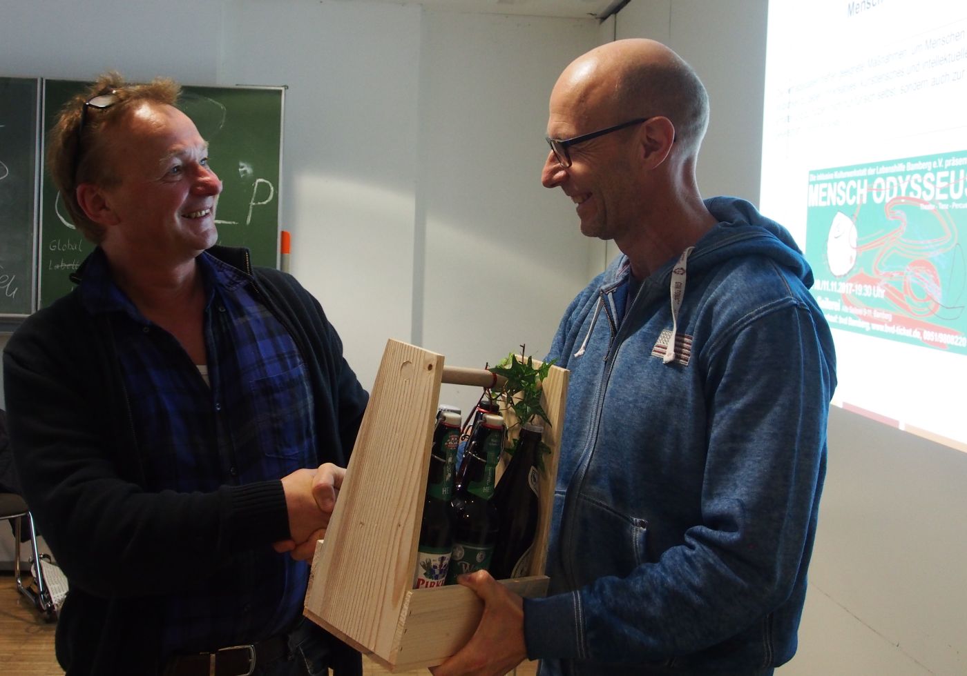 Schulartbetreuer Roland Kusche bedankte sich am Ende bei Herrn Hemm für einen mitreißenden Vortrag, der bei vielen Lehrkräften ein intensiveres Nachdenken über den Inklusionsbegriff in Gang gesetzt hat. Als kleines Dankeschön überreichte er im Namen des Kollegiums eine Oberpfälzer Zoiglauswahl.
