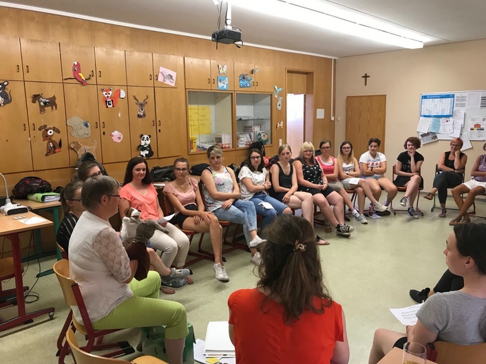 Der Kindergarten in Kirchendemenreuth, unter der Leitung von Frau Emmi Garg, verfügt über einen dieser speziellen faustlos-Koffer und führt das Konzept regelmäßig durch. Den Koffer, den Ablauf und ihre Praxiserfahrungen stellte uns Frau Garg im Rahmen des Vertiefungsunterrichts in einer Unterrichtsstunde vor.