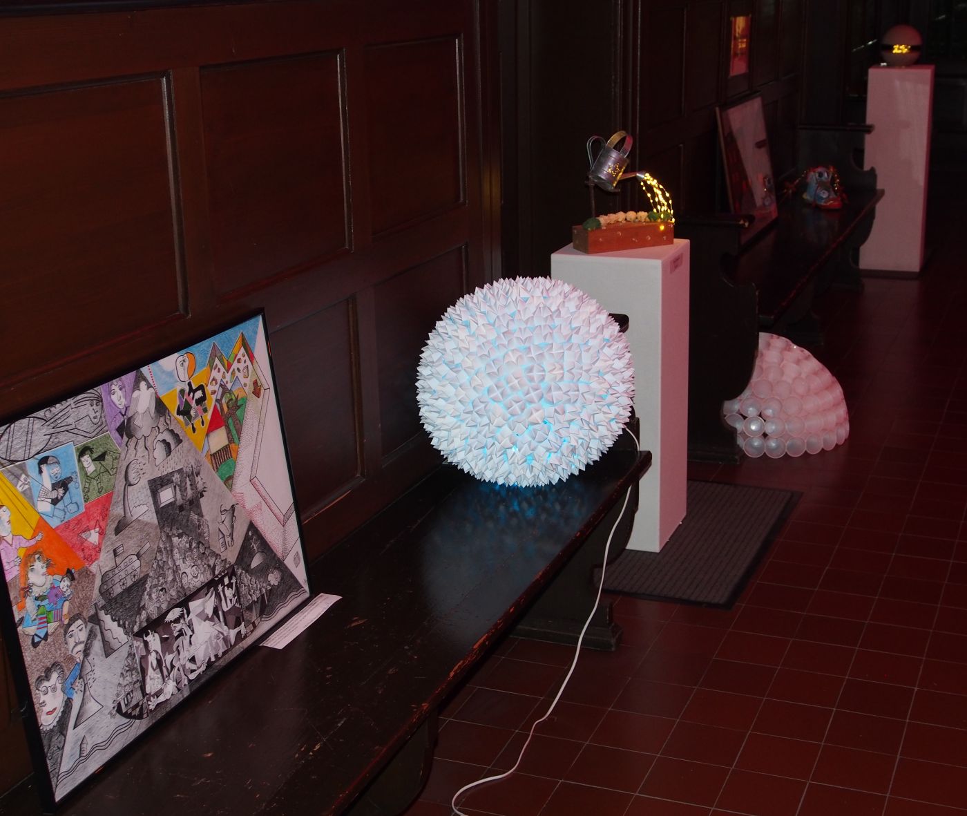 Jedem, der den Weg ins Alte Rathaus fand, wurde einiges geboten. Das historische Gebäude der Stadt Weiden, welches in erfrischendem Grün erstrahlte und dessen Räume in dunkles Rot getaucht waren, bot hierfür das perfekte Ambiente. Beim Eingang ins Rathaus waren zunächst einige Lichtobjekte aufgebaut, welche die Studierenden der beiden Studienjahre im Rahmen des Kunst- und Werkpädagogikunterrichtes selbst gefertigt haben. Einige Objekte waren so begehrt, dass teilweise beachtliche Summen für den Verkauf angeboten wurden, was vieles über die hohe Qualität der Ausstellungsstücke sagte. Leider waren aber sämtliche Unikate unverkäuflich.