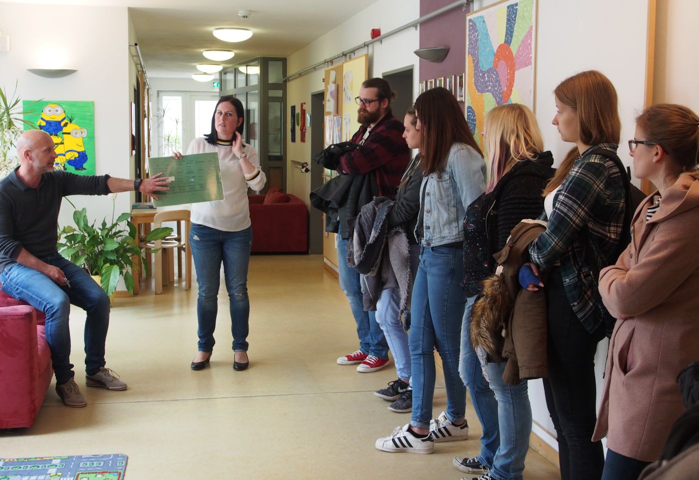Sie schilderten Aufnahmekriterien für die Tagesklinik, zeigten verschiedene Krankheitsbilder auf und beschrieben mögliche therapeutische Ansätze. Die Studierenden erfuhren beispielsweise von Kindern und Jugendlichen mit Störungen im emotionalen Verhalten, Mobbingopfern oder Suchterkrankungen und den Umgang mit diesen. Ein Rundgang durch die Tagesklinik schloss den sehr informativen und kurzweiligen Unterrichtsgang ab.