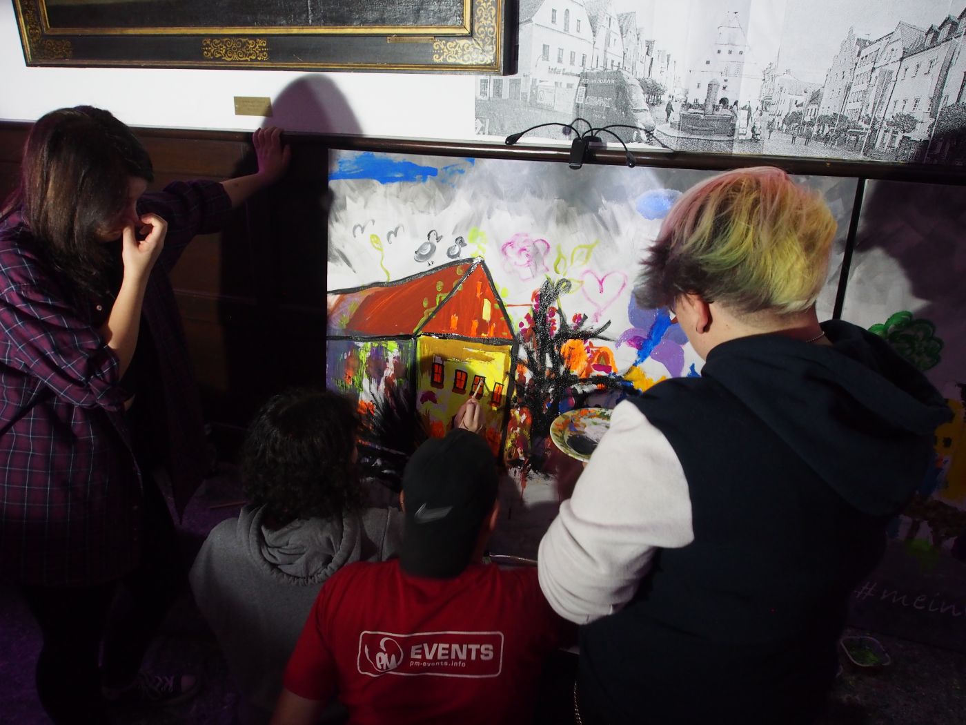 Anliegen der Studierenden war es aber auch in einem eigenen Bild Besucher zum Mitmalen zu animieren. Immer wieder konnte man dabei Besucher beobachten, wie sie sich künstlerisch einbrachten.