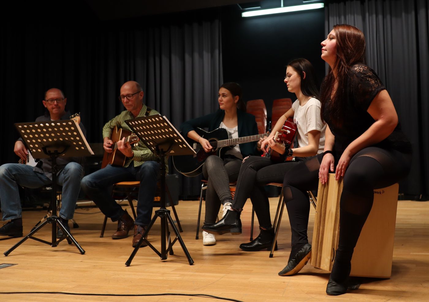 Nach der Begrüßung und Einführung stimmte die Schulband unter Leitung von Uli Schmutzer alle Zuhörer musikalisch mit Songs von Amy Winehouse und Uncle Cracker ein.