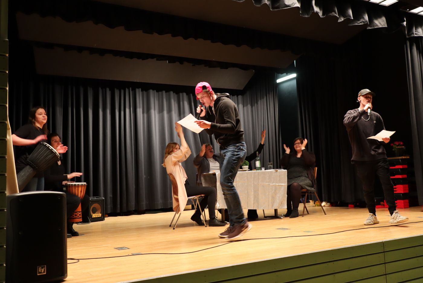 Vor der Pause versprühten dann die Mitglieder der Übung Theaterpädagogik ein wahres Feuerwerk. Beim Improvisationsstück „Am Tisch mit den Hartmanns“ entführten sie das Publikum in den Erziehungsalltag einer etwas chaotischen Familie. Auch wurde ihr schauspielerisches Können besonders deutlich beim Rap „Basti und die Befruchtungszwerge“, welches mit lautem Applaus des Publikums honoriert wurde.