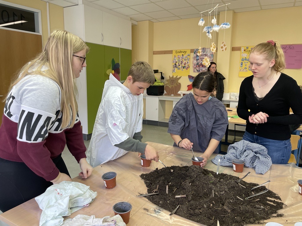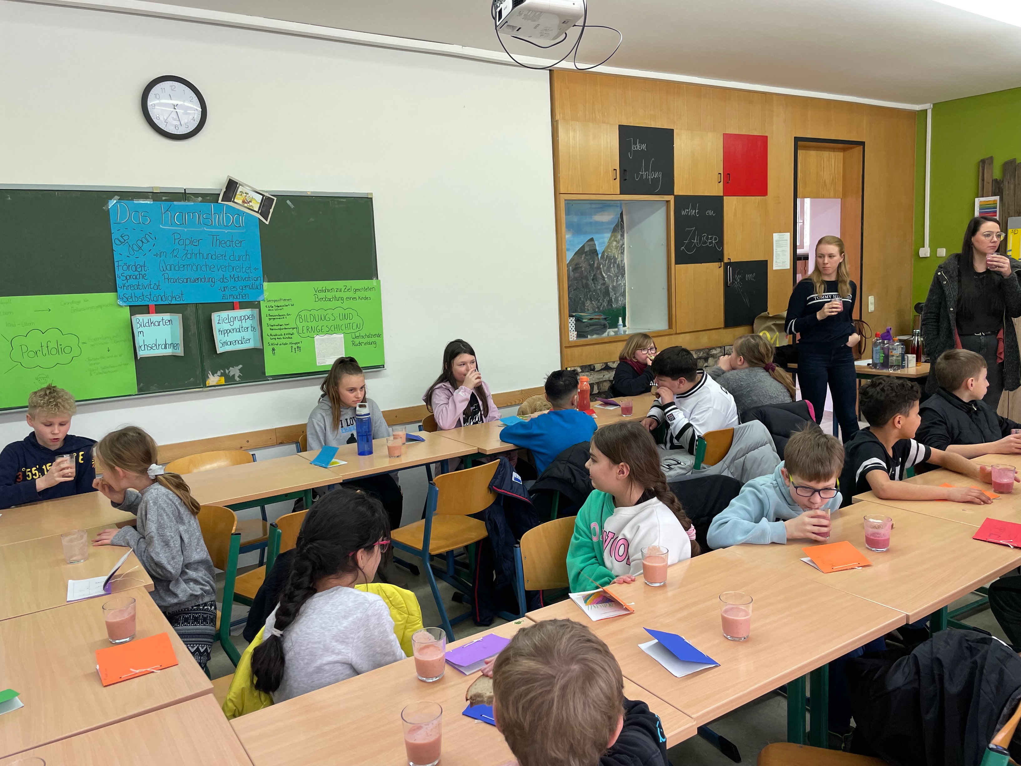 In der „Umwelt-Gruppe“ bemalten die Kinder einen Blumentopf, welchen sie anschließend mit Schnittlauch, Kresse und Petersilie ansäen durften. Im Bereich Ernährung waren die Kochfähigkeiten der Schüler*innen gefragt. Leckere kleine Häppchen, wie belegte Brote, Gemüsesticks und Smoothies wurden hier zubereitet und das gemeinsame Schlemmen am Ende der Veranstaltung durfte natürlich nicht fehlen! Ein weiterer Workshop stand im Zeichen der Förderung von Motorik und Bewegungsfreude. In einem Stationenlauf konnten die Teilnehmer*innen ihre sportlichen Fähigkeiten unter Beweis stellen. Bei „Hampelmännern“, Seilspringen, Kegeln und einem Parcourlauf kamen die Grundschüler*innen ins Schwitzen. Am Ende des erlebnisreichen Vormittags wurden die Sieger für ihre sportlichen Leistungen geehrt und erhielten eine Medaille.