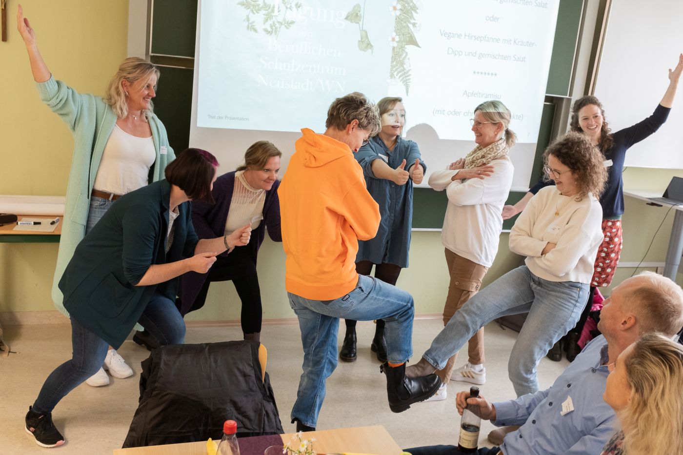 Im Anschluss an ein sehr ansprechendes Buffet, zubereitet von den Schülerinnen des Fachbereichs Ernährung und Versorgung, ging es gestärkt an die Arbeit: In Kleingruppen widmete man sich den Schwerpunkt-Themen: SEJ (Sozialpädagogisches Einführungsjahr), Unterricht im Fach PMG, Praxisbesuche und Berufspraktikum unter Leitung der Lehrkräfte der FakS Neustadt. So konnten die PMG-Lehrkräfte in einen sehr gewinnbringenden Austausch treten und neue Denkanstöße, neue Sichtweisen, neue Betrachtungsweisen erlangen. Gerade diese informellen Gespräche bilden das Gerüst einer solchen Fachtagung.