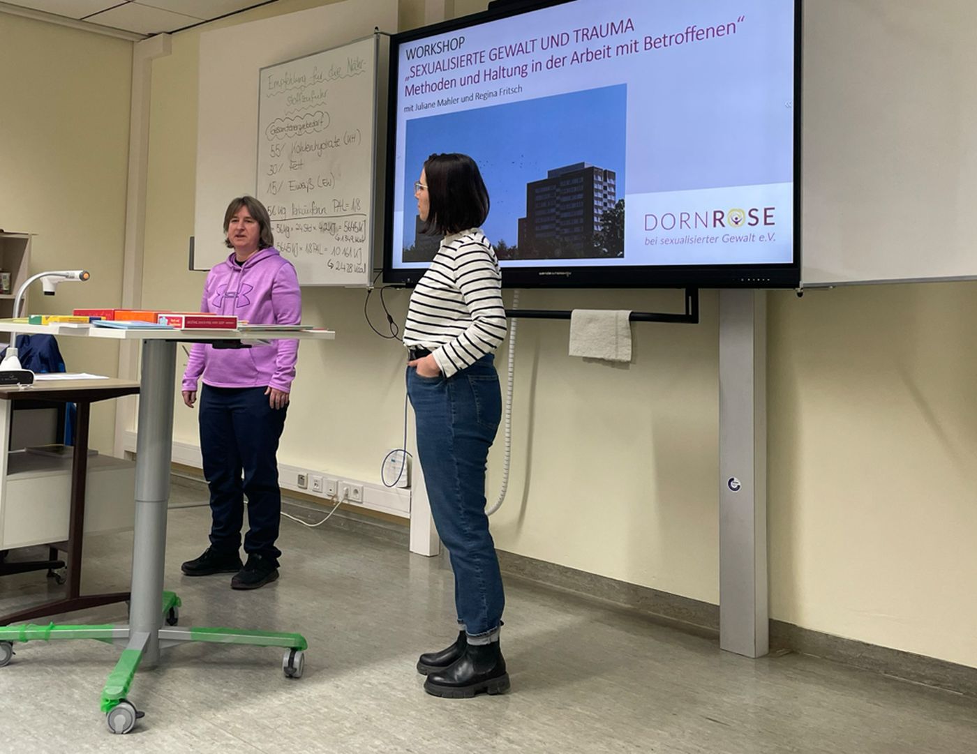 In zwei Workshops zum Thema „Trauma und Sexualisierte Gewalt“ vermittelte die Sozialpädagogin Frau Juliane Mahler mit Ihren Kolleginnen Angela Frank und Regina Fritsch den Studierenden wichtige Inhalte und Erfahrungen aus der praktischen Beratungsarbeit. So lernten diese auch verschiedene Übungen kennen, die bei Dornrose zum Einsatz kommen.
