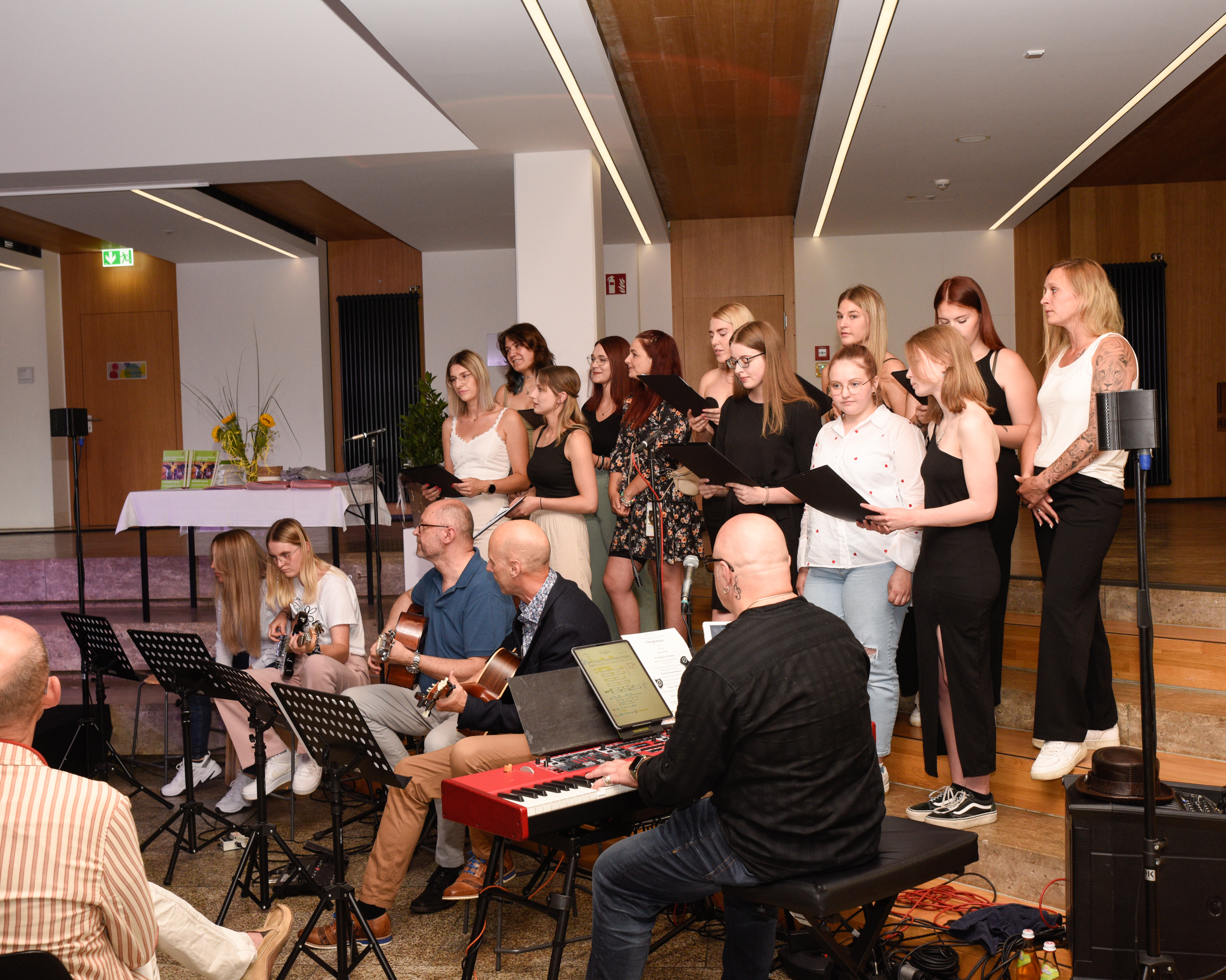 Einen feierlichen Rahmen verliehen der Abschlussfeier die Studierenden der Fachakademie mit ihren Lehrkräften Ulli Schmutzer und Max Braun durch mitreißende Musikstücke wie „Mr. Brightside“ oder „Flowers“.
