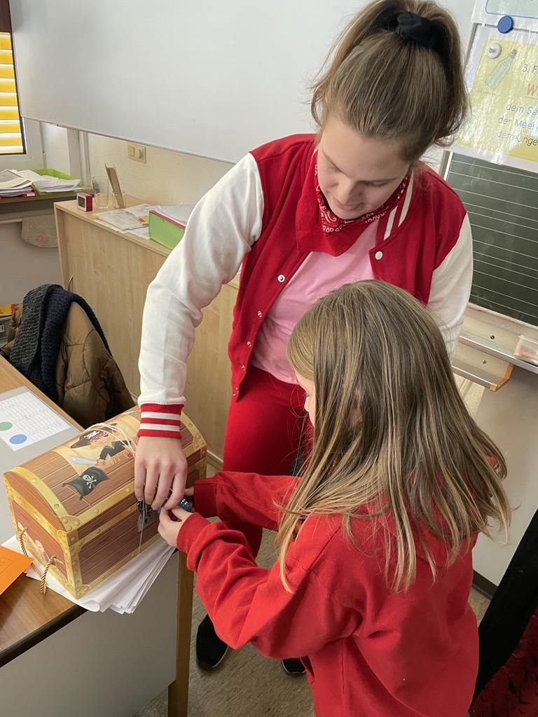 Nach einem Kennenlernspiel lud die erste Station die Kinder der 4b dazu ein, Masken zu basteln. Begleitet von motivierenden Faschingshits entstanden kreative Ergebnisse, über welche sich die Kinder sehr freuten. An einer weiteren Station durften sich die Schüler in einem Kooperationsspiel beweisen und in der 3. Station konnten sie ihre kognitiven Fähigkeiten beim Lösen von Rätseln unter Beweis stellen. Natürlich durfte auch die Bewegung nicht fehlen und somit schlängelten sich die Kids durch eine Bewegungsstation. Zum Schluss mussten die vier Gruppen Textaufgaben lösen, um die richtige Zahl für das Zahlenschloss an unserer Schatzkiste zu bekommen. Als den Kindern das gelungen ist, freuten sich alle über den Schatz, der in der Kiste versteckt war. Außerdem holten sich die Studierenden der FakS 3a am Ende des Tages Feedback der Schulkinder ein, da im Anschluss an die Durchführung im Klassenverband mit der Lehrkraft Frau Habermeier herausgearbeitet wurde, was gut gelaufen ist und wo in Zukunft Entwicklungspotential besteht. So wurde im Rahmen der Projektdurchführung Erfahrung in der Bildungsarbeit mit unbekannten Teilnehmern gesammelt und die Schülerinnen und Schüler hatten durchgehend sehr viel Spaß bei den Stationen.