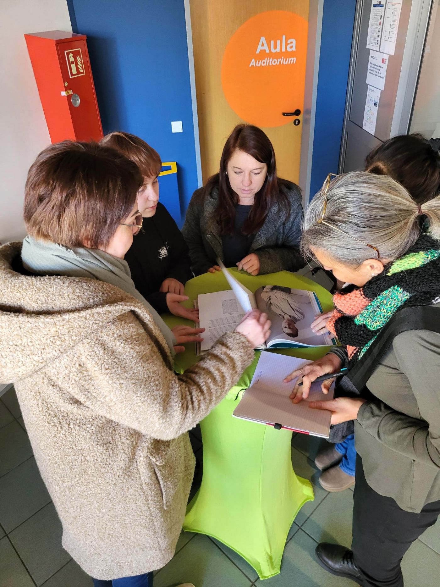 Warkentin verwies auf seine eigene Biografie, bevor er den Zuhörinnen und Zuhörern des BSZ Neustadt wertvollen Input zur Geschichte der Spätaussiedler gab. Das Buch „Mein Name ist Eugen“ von Eugen Litwinow rückte in einem zweiten Teil der Veranstaltung in den Vordergrund. In Gruppen aufgeteilt konnten die Studierenden und Schülerinnen verschiedene Protagonisten , die in Russland Evgenij hießen und heute Eugen heißen, kennenlernen. Schon der oft unfreiwillige Namenswechsel wurde aufgegriffen, aber auch das Aufwachsen zwischen zwei Kulturen wurde thematisiert. Erfahrungen von Diskriminierung und die immer noch vorhandenen Vorurteile gegen Menschen aus Osteuropa in der medialen Debatte konnten in den Gruppen diskutiert und im Plenum anschließend vorgestellt werden.