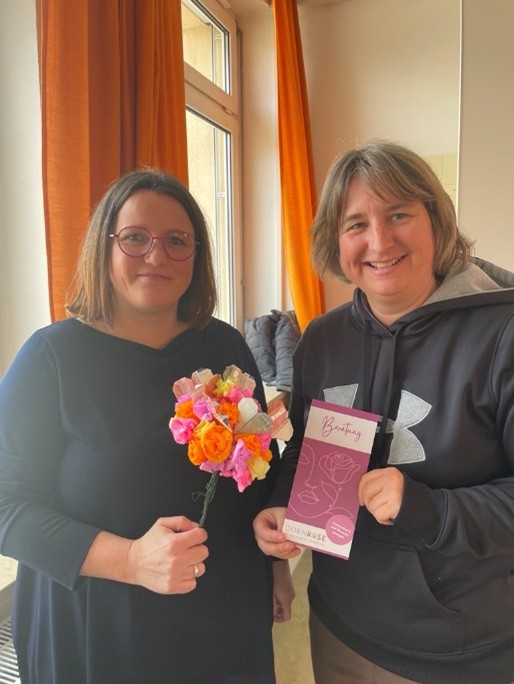 Ein besonderer Dank gilt an dieser Stelle Angela Frank und Regina Fritsch für Ihr großes Engagement in der zielgruppenorientierten und offenen Art der Zusammenarbeit. Die Studierenden der FakS 2a und 2b haben ihren Dank und ihre Wertschätzung ausgedrückt, indem am Ende des Vortrags ein gebastelter Rosentrauß aus der FakS 2b mit einer Geldspende, sowie ein Dankesglas, ebenfalls mit einer Geldspende versehen, aus der FakS 2a an Dornrose e. V. übergeben wurde. Mit dieser Spende setzt sich die FakS gemeinsam für eine Welt ohne Gewalt ein.