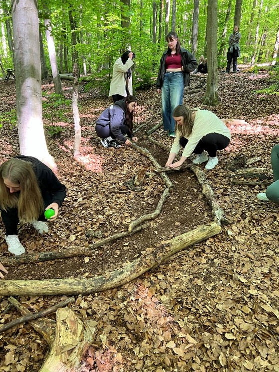 In zwei Gruppen durften die Studierenden unterschiedliche erlebnispädagogische Spiele im Wald kennenlernen. So bestand die erste Aktivität einer Gruppe darin, einen persönlichen „Schatz“ am Waldboden zu finden – etwa ein Blatt, ein Ast oder ein Tannenzapfen – und diesen der Gruppe vorzustellen. Daran anschließend wurde in Kleingruppen eine Kugelbahn den Hang hinab gebaut. Jede Gruppe konstruierte einen eigenen Abschnitt mit Kurven und Hindernissen, wobei alle Teilstücke am Ende zu einer durchgängigen Bahn zusammengeführt wurden – zur großen Freude aller Beteiligten funktionierte das Experiment einwandfrei.