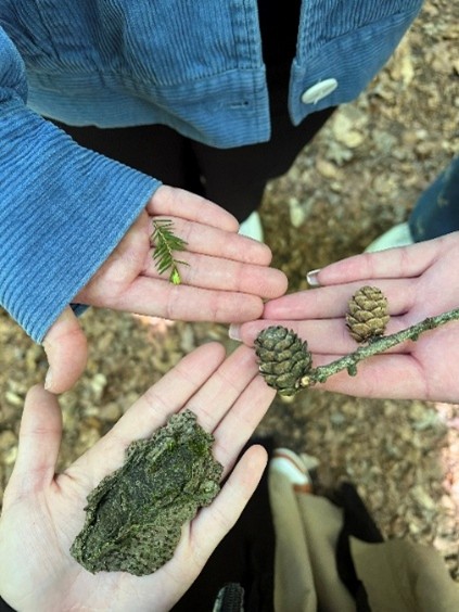 Ein besonders ruhiger und atmosphärischer Moment entstand beim „Spiegelgang“: Mit einem kleinen Spiegel unter der Nase erkundeten die Studierenden den Wald aus der Perspektive eines Tieres – etwa eines Rehs oder Insekts – und ließen die Umgebung auf sich wirken.