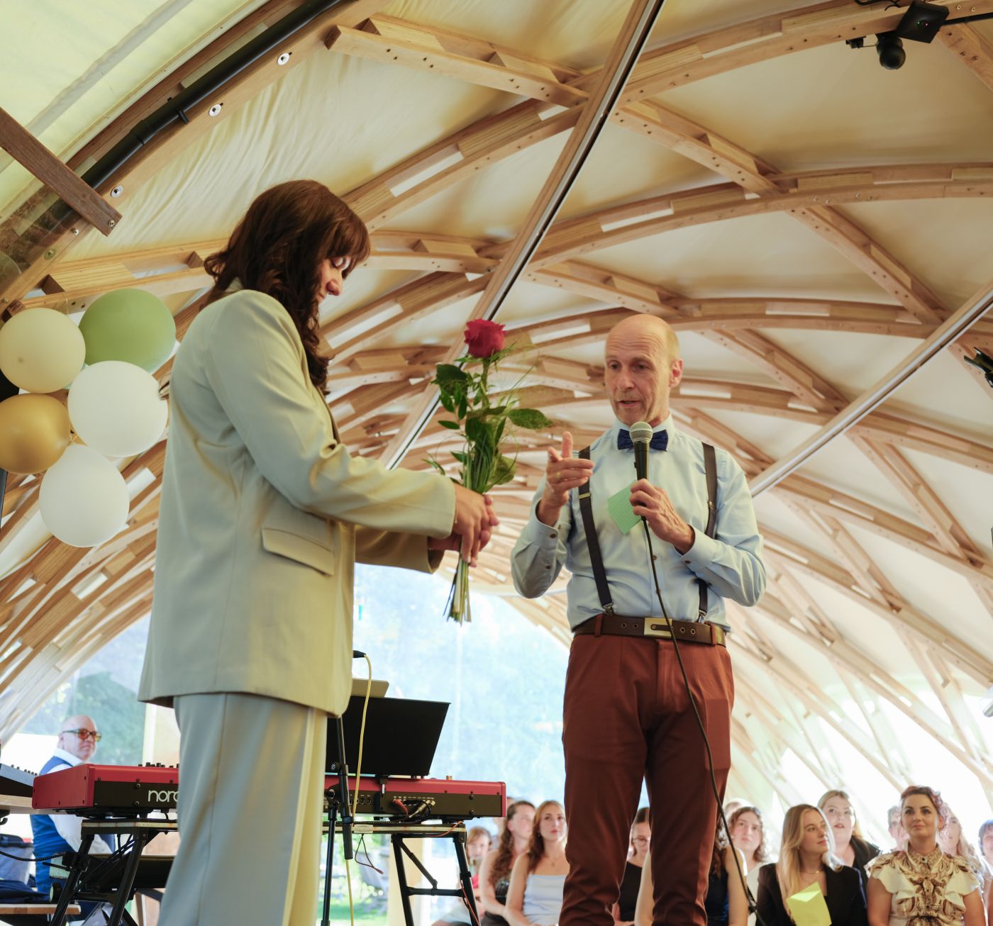Ein Höhepunkt der Feier war dann die Festrede des Leiters der Fachakademie, StD Roland Kusche. Mit einer Rose, die von der Studierenden Nicola Stöcker gehalten wurde, veranschaulichte er auf beeindruckende Weise, was den Erzieherberuf ausmacht: Die Blüte steht für die Leidenschaft, mit der die künftigen Fachkräfte in ihrem Beruf wirken sollen. Der angenehme Duft symbolisiere die positiven Spuren, die sie im Leben der Kinder und Jugendlichen hinterlassen können und die Dornen weisen auf die unvermeidlichen Herausforderungen und Widerstände hin, die es im Beruf zu überwinden gilt. Seine Worte berührten viele Anwesende und machten deutlich, wie wichtig innere Haltung. Einfühlungsvermögen und Standhaftigkeit im pädagogischen Alltag sind.