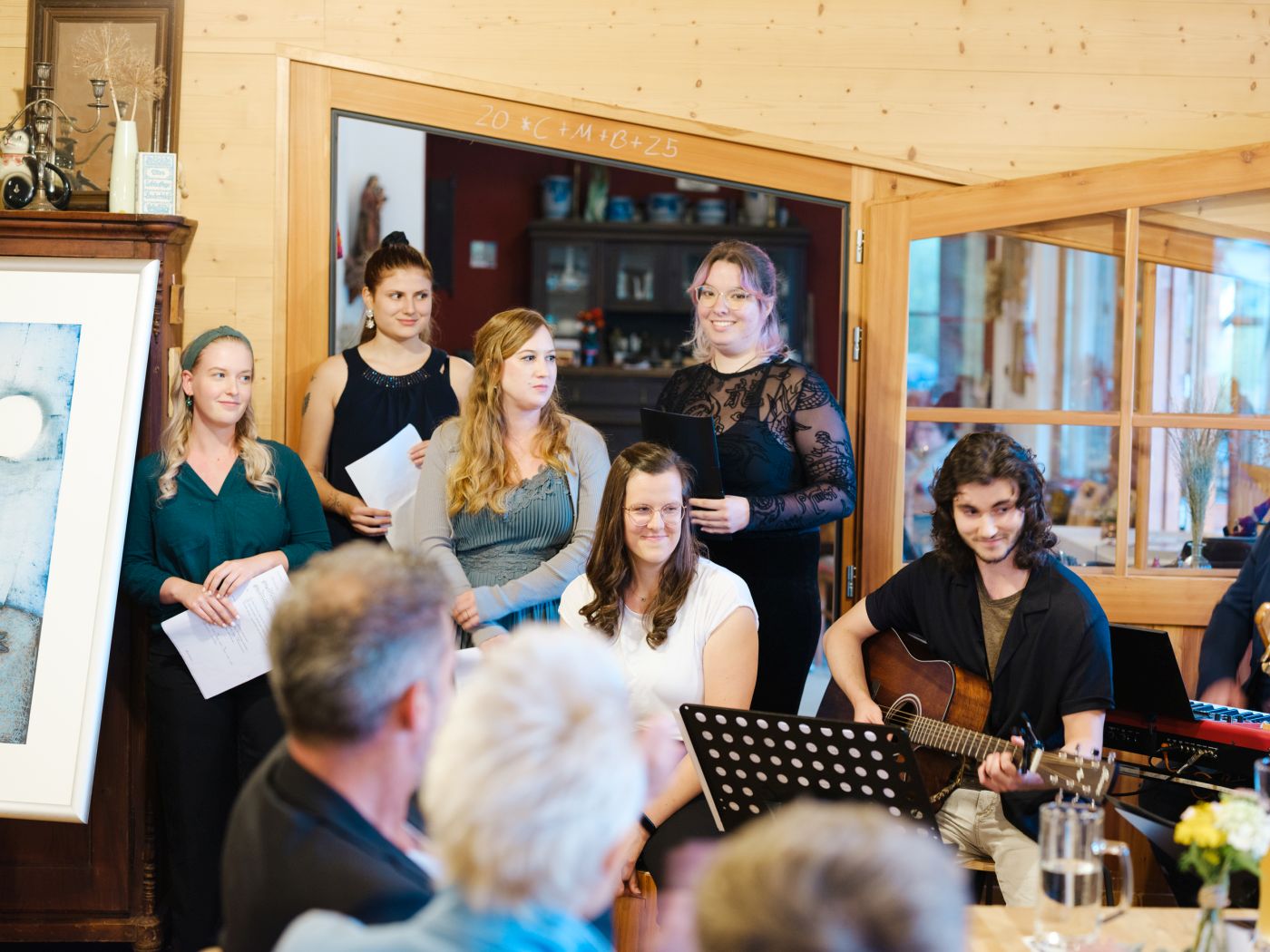 Mitschülerinnen der ersten Fachklasse sorgten mit einer Bewegungsgeschichte für Bewegung aller Gäste und gaben gute Wünsche am Schluss mit dem Lied „Möge die Straße“ an die Absolventen weiter. Über einen Geldpreis und anerkennende Worte der Ehrengäste freute sich die Beste, Doris Sommer, die einen Notendurchschnitt von 1,00 hatte.