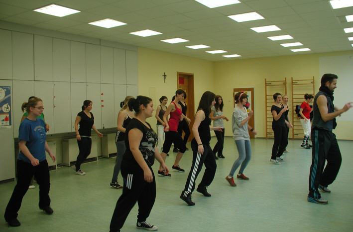 Der Zumbatrainer Christopher Oellerich begeisterte und fanzinierte alle Schüler trotz schweißtreibender Choreographien.
