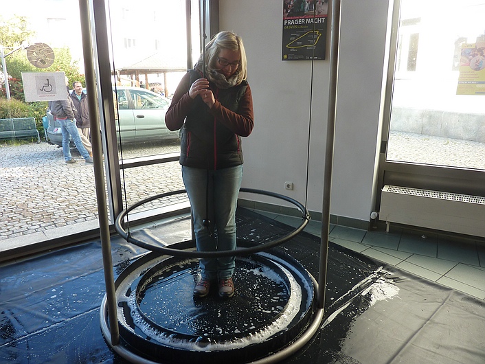 Mit der richtigen Mischung aus Schwung und Behutsamkeit stehst du einen Moment in einer großen Seifenblase.