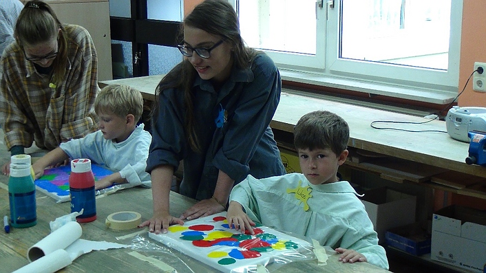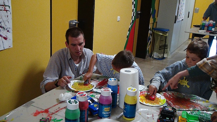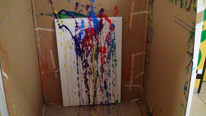 Hier konnten die Kinder mit einer Farbspritze eine Leinwand künstlerisch bespritzen. Bei dieser Aufgabe hatten die Kinder besonders viel Spaß. Auch das Resultat kann sich sehen lassen.