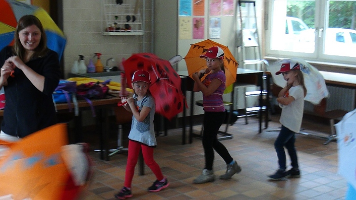 Wieso regnet es eigentlich? Mit dieser Frage weckten die Schülerinnen der K 10 b den Forschergeist der Kindergartenkinder. In einem Experiment wurde genau dieser Frage auf den Grund gegangen. Mit einem Wasserkocher und einer Schöpfkelle voller Eiswürfel wurde den Kindern dieses Phänomen veranschaulicht. Natürlich durften die kleinen Forscher selbst experimentieren. Abgeschlossen wurde diese spannende Station mit einem Regenschirmtanz.