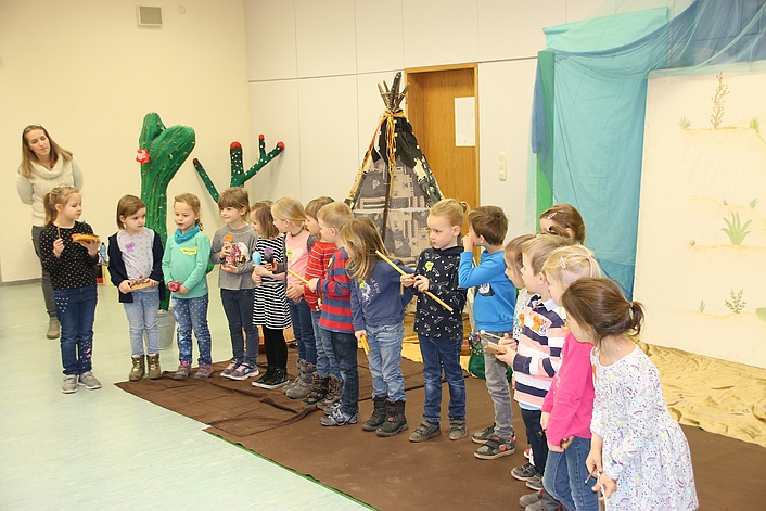 Tatsächlich hörte man nach kurzer Zeit die ersten Regentropfen. Die ersten Blumen waren zu sehen, die Bäume und Felder wurden grün und auch der Mais keimte. Die Kinder hatten es geschafft: Der Frühling war erwacht. Zum Dank überreichte der Indianerstamm dem St. Joseph Kindergarten die Maispflänzchen. Auch die hergestellten Trommeln durften die Kinder mit nach Hause nehmen.
