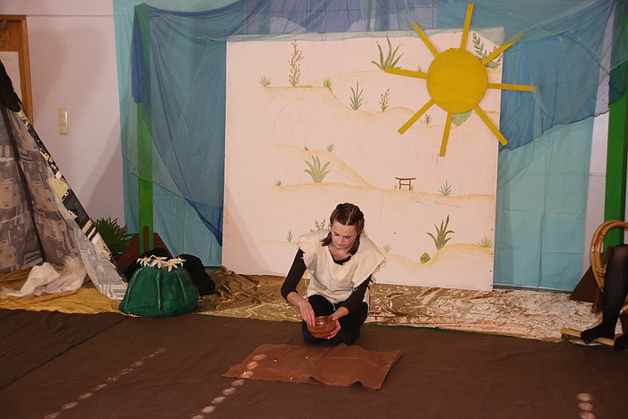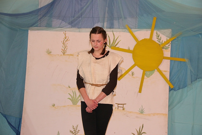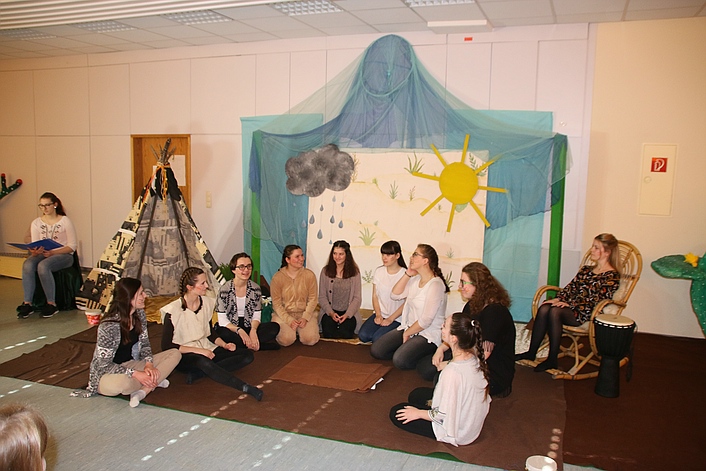 Um auch den Kindern etwas Besonderes zu bieten, wurde gemeinsam mit der K 10a, unter der Leitung von Herrn Stadler, Frau Dütsch und der Musikpädagogin Frau Strupf-Daub, das Theaterstück „Das Indianermädchen Amitola“ einstudiert.