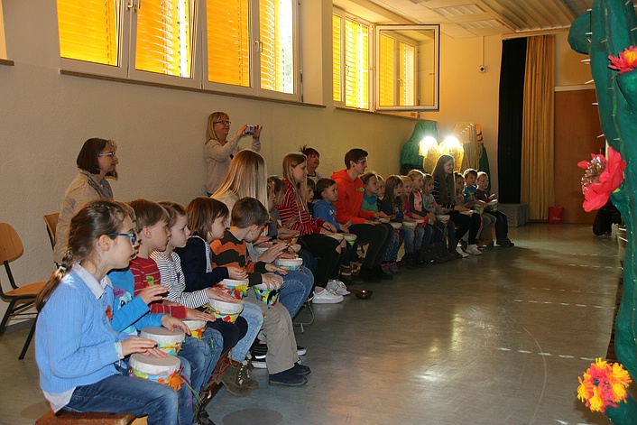 Bevor diese zum Einsatz kamen, überraschten die Kinder die Klasse mit einem „Guten-Morgen-Lied“. Dabei verwende-ten sie viele unterschiedliche Musikinstrumente.