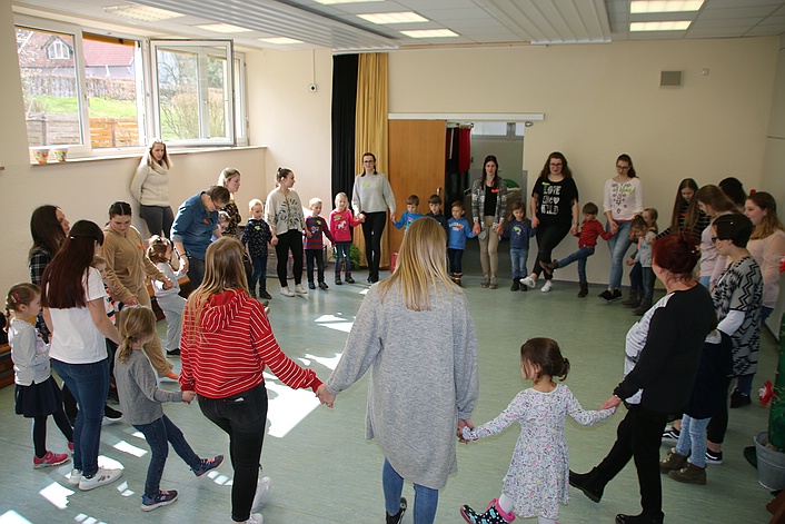 Nach dieser gesunden Brotzeit und einem Fotoshooting vor der Kulisse sangen und tanzen die Schüler und Kinder gemeinsam spontan im Kreis zur Verabschiedung.
