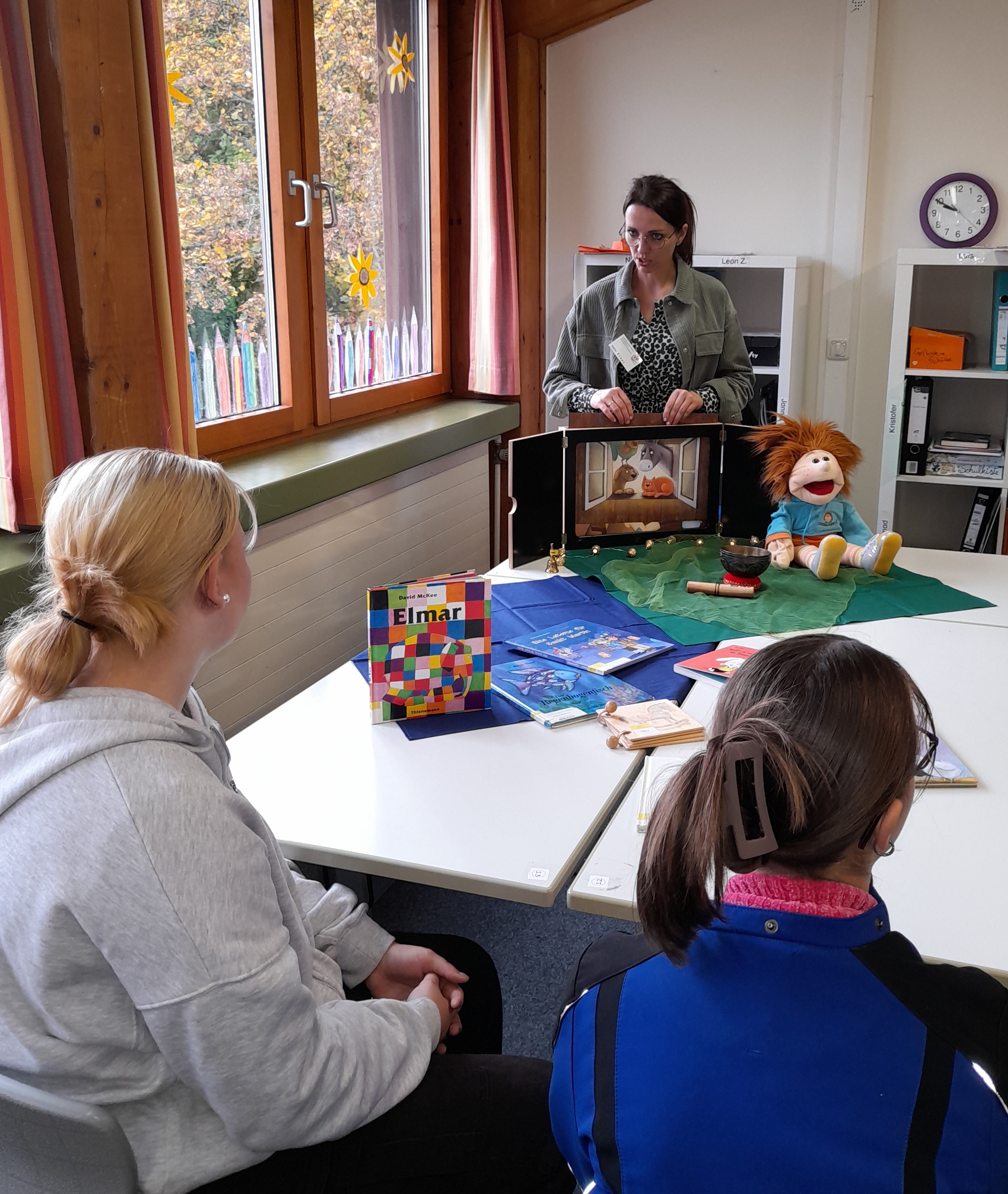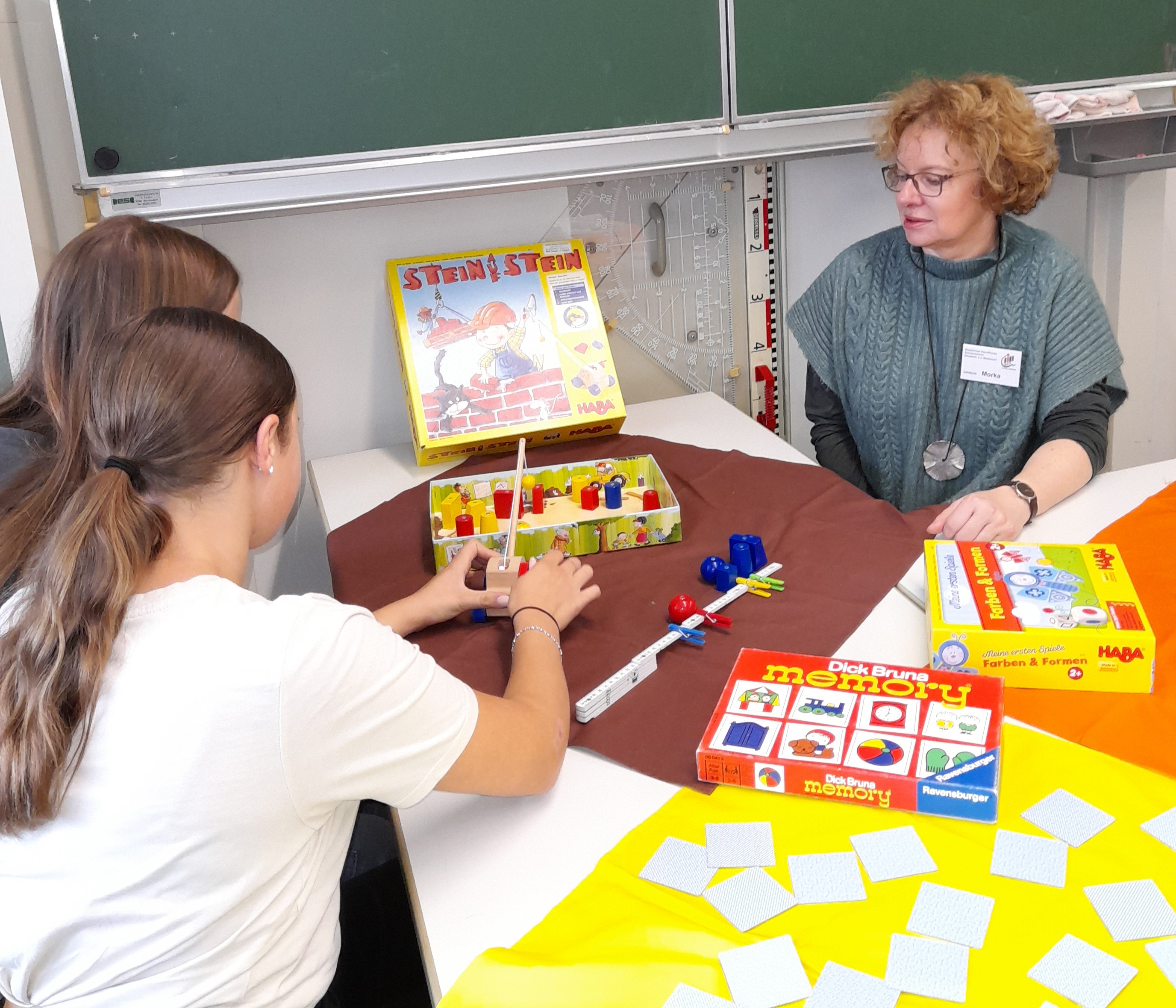 Beim Aktionstag an der Mittelschule Vohenstrauß konnten sich die Schüler*innen der 8. und 9. Jahrgangsstufe der Mittelschulen Vohenstrauß und Pleystein in verschiedene Berufsfelder machen. In einem 45-minütigen Workshop erhielten die Interessent*innen Einblick in die verschiedenen Fächer der Ausbildung – sie wurden mit einem Rhythmus-Vers Willkommen geheißen, konnten bei verschiedenen Tischspielen die Lerneffekte für die Zielgruppe Kinder erkennen und so die Aufgaben einer Kinderpfleger*in erkennen. In der Märchen- und Geschichten-Ecke erfuhren die Teilnehmer*innen die Bedeutung der pädagogischen Aufbereitung von Märchen und Bilderbuchgeschichten anhand von Klangschalen-Signalen oder gestalteten Märchenfiguren, die das Erzählen begleiten, oder anhand des Einbezugs der Kinder bei der Bilderbuchbetrachtung anhand von gezielt überlegten Fragestellungen. Ein Hör-Memory lud ein, dem Rascheln beim Schütteln eines gefüllten Gefäßes genau zuzuhören, um gleiche Klänge herauszuhören. Dabei wurde überlegt, mit welchem Material die Gefäße gefüllt sein könnten. Die Lehrkräfte informierten außerdem über den Verlauf der Ausbildung, über mögliche Arten von Praxisstellen, die die Ausbildung begleiten, sowie über die Eigenschaften und Fähigkeiten, die als zukünftige*r Kinderpfleger*in von Bedeutung sind.