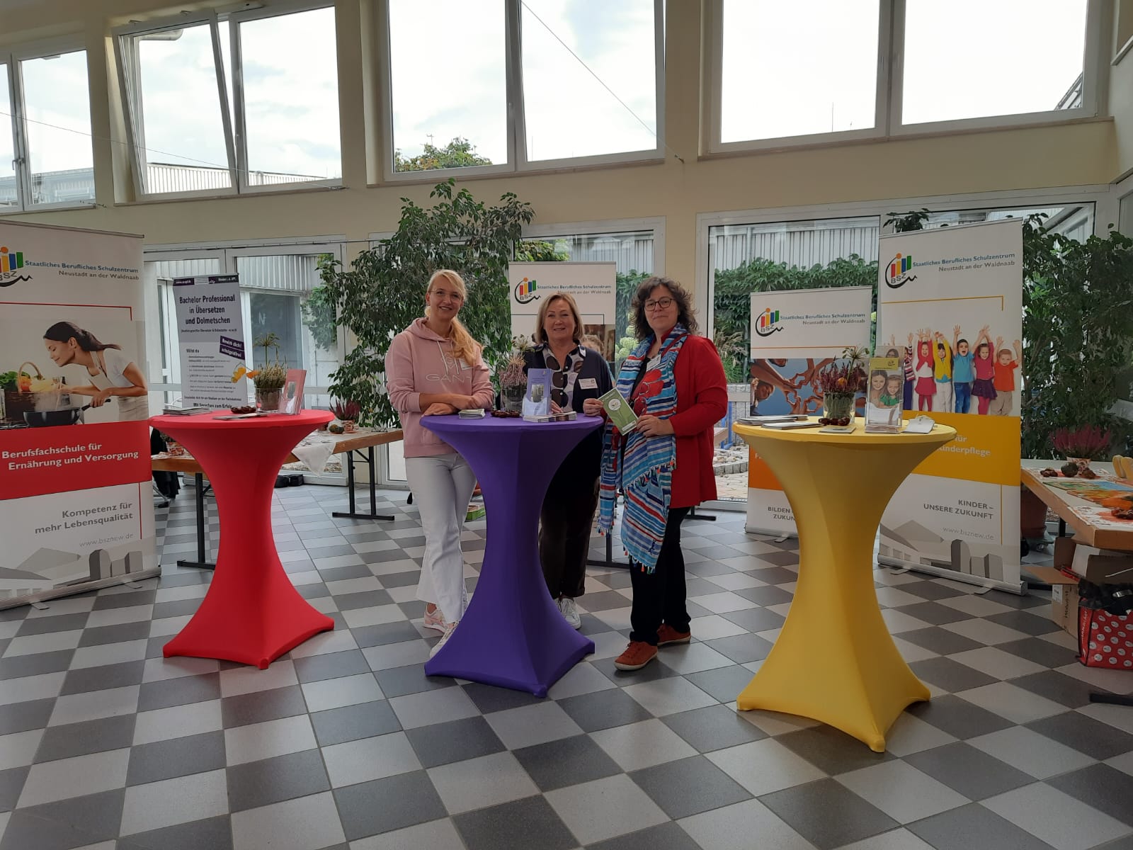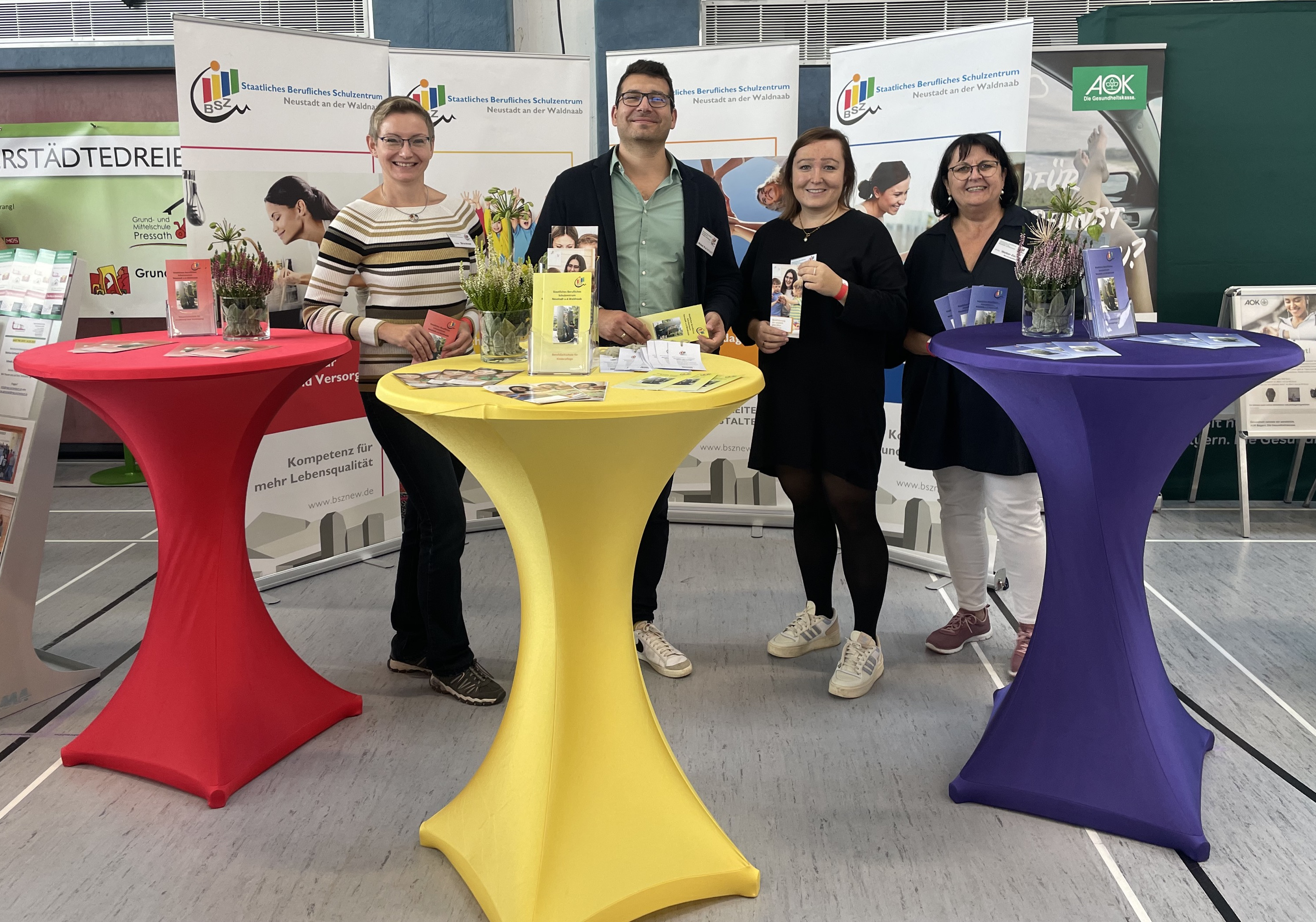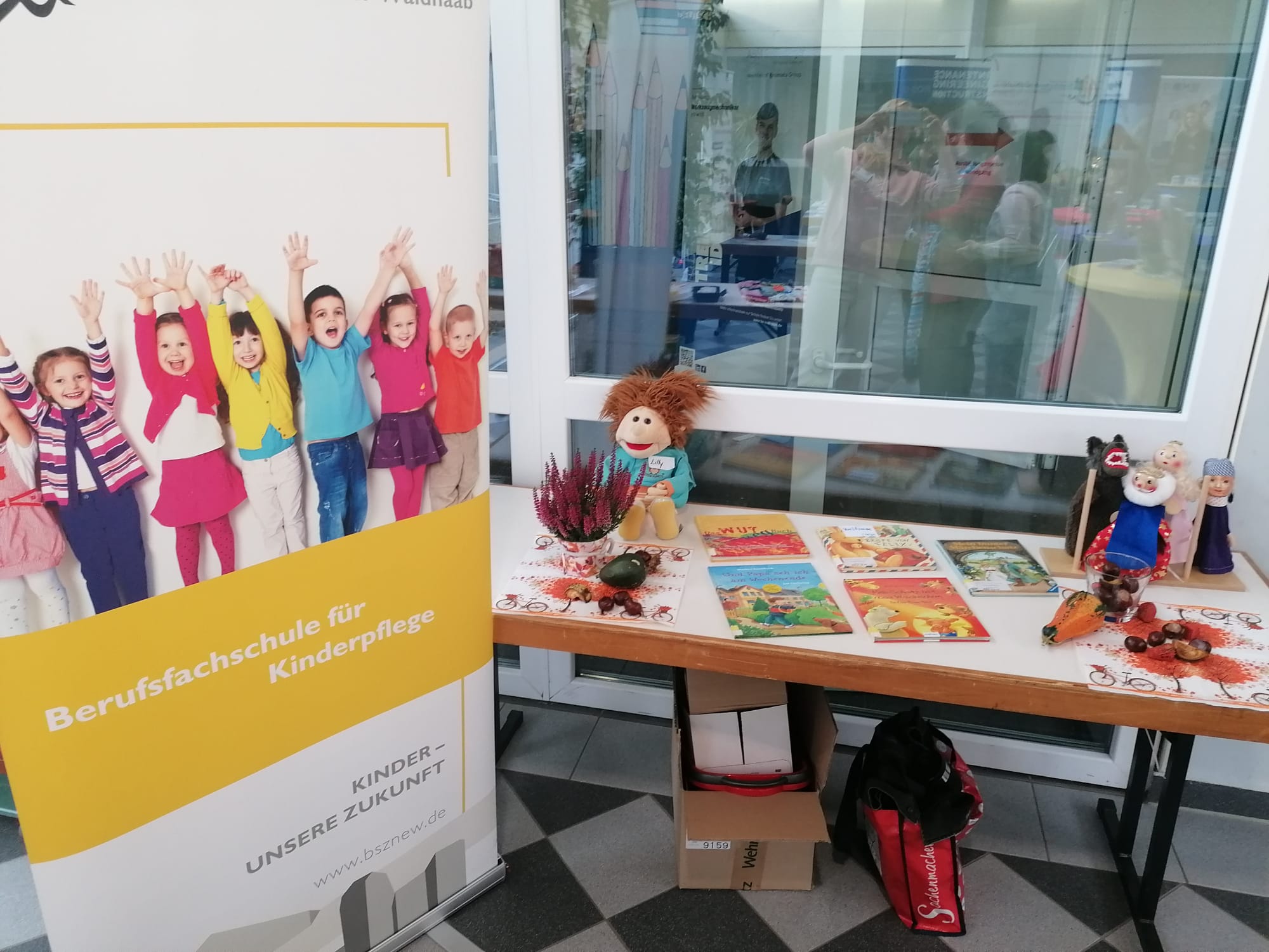 Im Oktober waren die Lehrkräfte des Fachbereichs Kinderpflege auf Werbe-Tour: Bei den Ausbildungsmessen in Eschenbach und in Kemnath wurden interessierte Abschlussschüler*innen über den Verlauf der Ausbildung zum/zur Kinderpfleger*in an der Berufsfachschule für Kinderpflege am Beruflichen Schulzentrum Neustadt an der Waldnaab informiert. Das Personal des Beruflichen Schulzentrums Neustadt beriet die Interessent*innen und gab anhand von Informationsmaterial sowie Unterrichtsmaterial Einblicke in die praxisorientierte Ausbildung, die mit mehreren Blockwochen innerhalb der zwei Ausbildungsjahre sehr eng verknüpft ist mit verschiedenen Sozialpädagogischen Einrichtungen wie Kinderkrippe, Kindergarten oder Kinderhort ist.