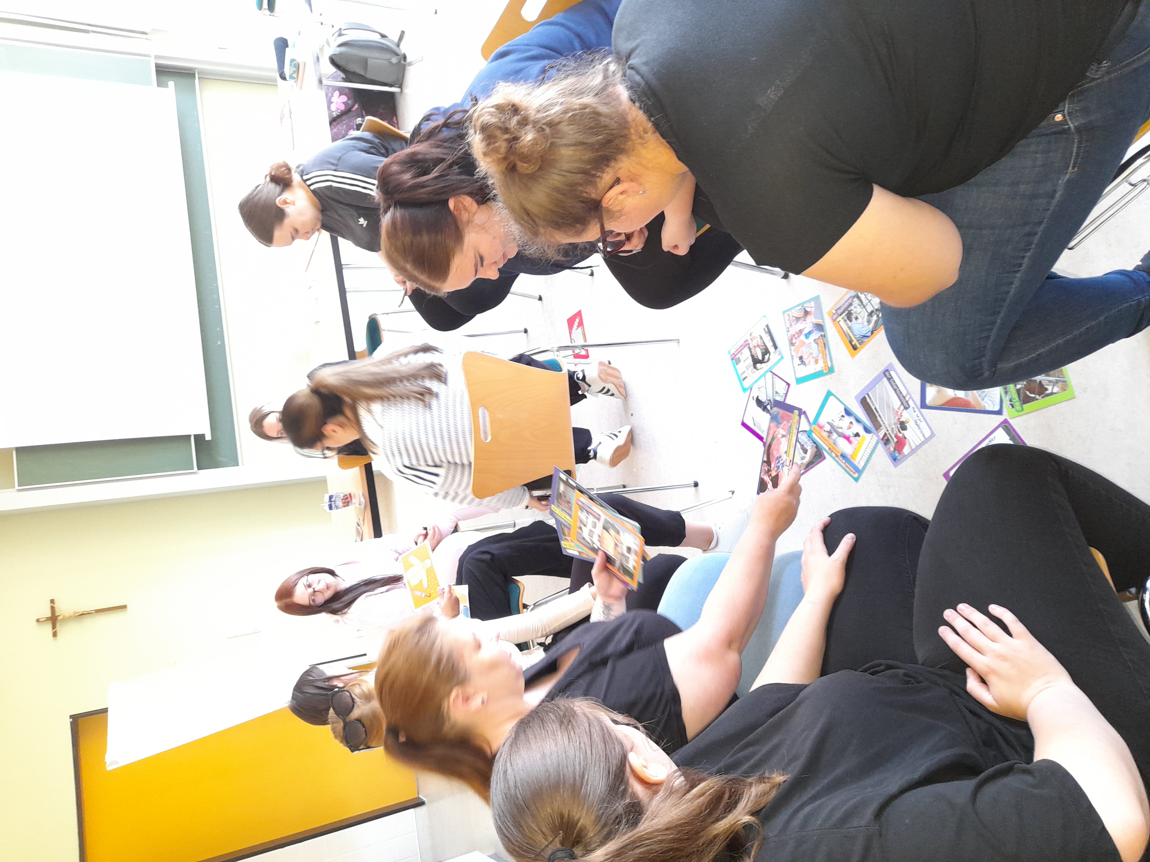 Man beschäftigte sich zuerst mit der Frage „Wie kann Sprache gefördert werden?“ – Einige der vorgestellten Methoden kennen die Kinderpflegerinnen und Kinderpfleger bereits aus ihrer Ausbildung, wie die Einführung von Liedern und Reimen, die Betrachtung von Bilderbüchern und Wimmelbüchern oder das kreative Rollenspiel, nicht zu vergessen die Kommunikation bei Alltagserlebnissen und -handlungen.