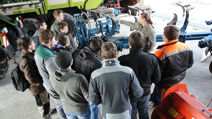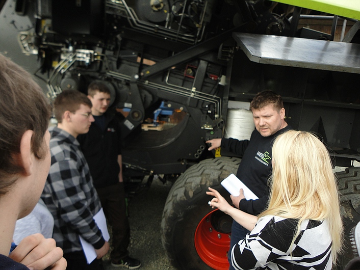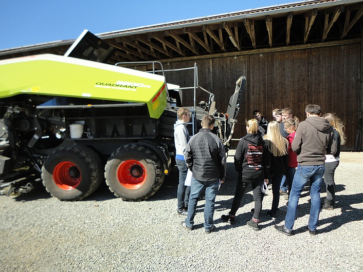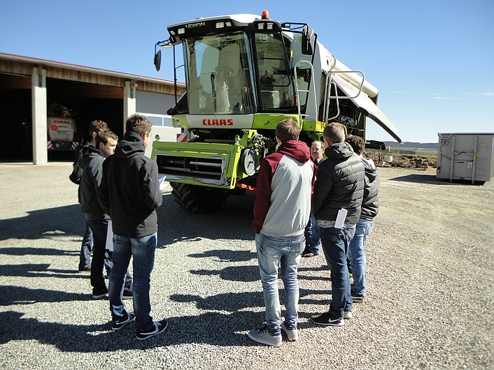 Wie schon in den letzten Jahren werden die landtechnischen, fachpraktischen Inhalte in den Klassen Agrarwirtschaft Fachstufe I und II von Landwirtschaftsmeistern übernommen. Sie nehmen dafür die eigenen Maschinen her und bereiten sie etwas auf. Zum Beispiel werden Abdeckungen abgebaut, damit man Schrägförderer, Dreschtrommel, Nachdruschorgane, Schüttler und Siebe besser sieht und ihre Funktion erklären kann. So kann der Schüler später nicht nur die Funktion einer Maschine erklären, sondern auch die Arbeitsqualität der Maschine besser beurteilen und eventuell beim Lohnunternehmer auf eine bessere Einstellung hinweisen.