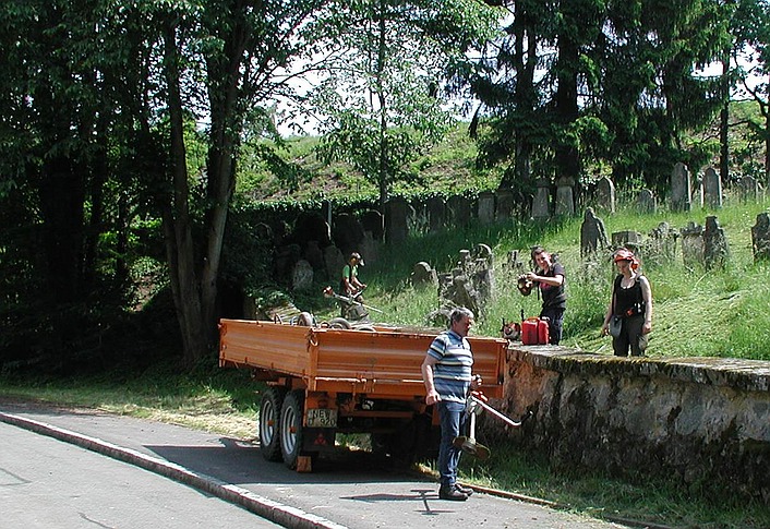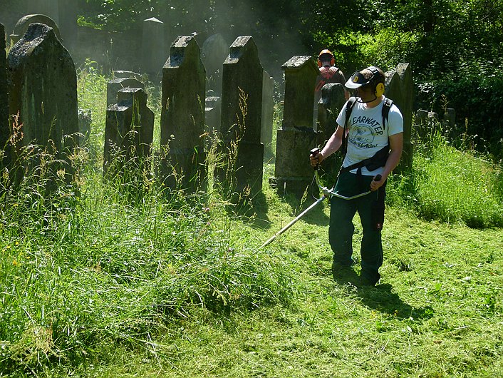 Wie in den Jahren zuvor leisteten die Schüler auch diesmal hervorragende Arbeit. Denn die Arbeit mit Balkenmäher und Freischneider will gelernt sein, zumal hier auf dem jüdischen Friedhof, wo mit äußerster Sorgfalt vorzugehen ist, um einerseits keine Grabsteine zu beschädigen und andererseits auch die Totenruhe oder die jüdischen Friedhofsgepflogenheiten zu beachten, z.B. dass statt Blumen kleine Steine auf den Grabsteinen abgelegt werden.
