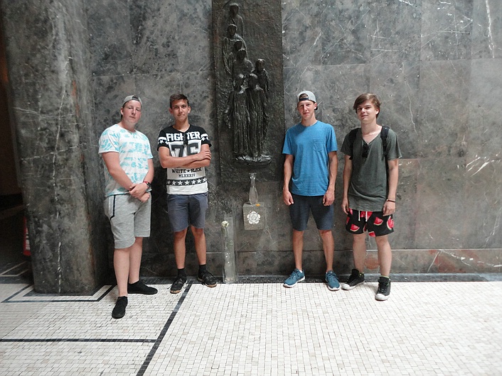 So steht es nicht in unseren Schulbüchern“ die vier Praktikanten vor der Gedenkstätte „Weiße Rose“.